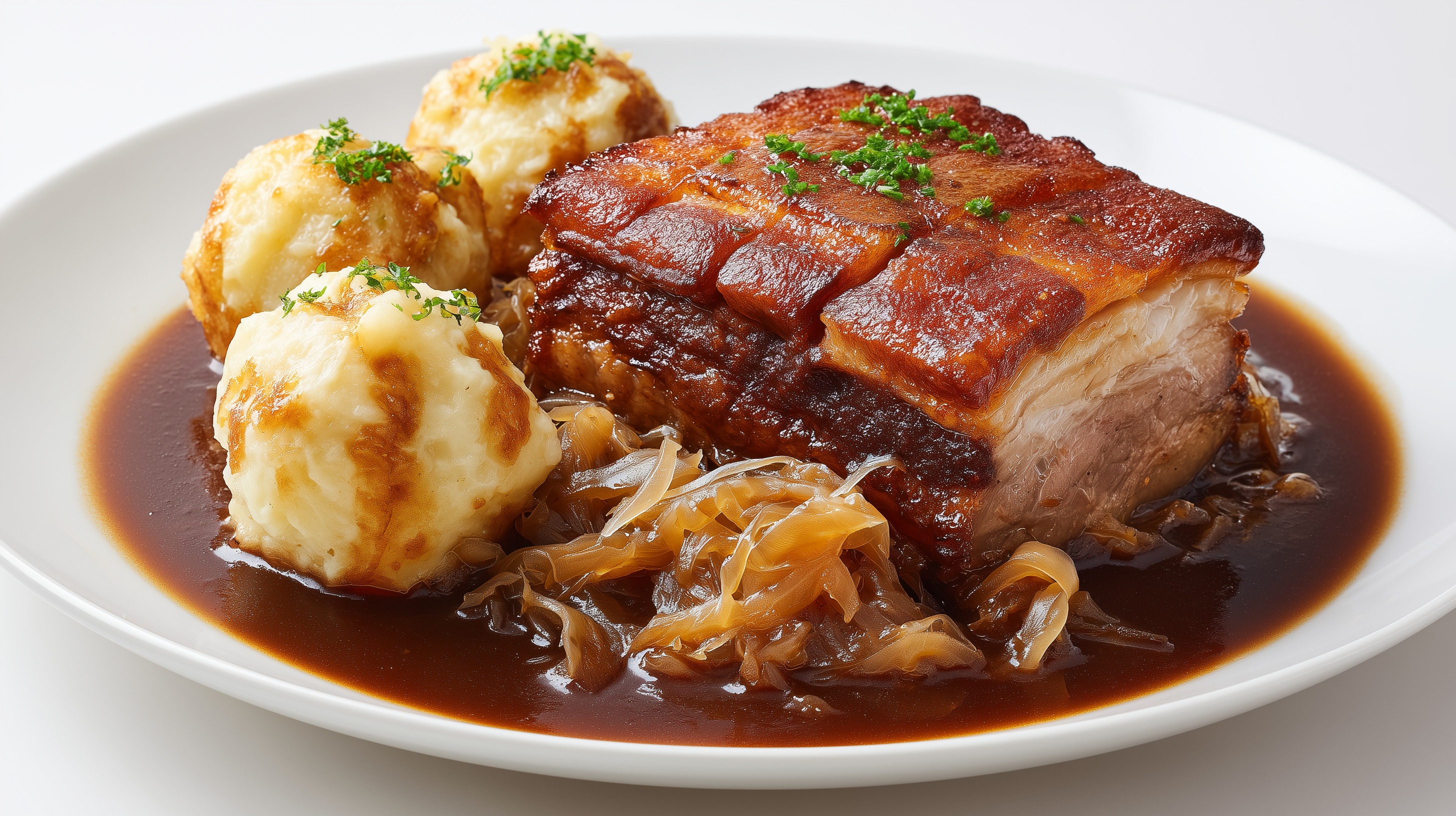 - Den Braten in Scheiben schneiden und gemeinsam mit den Knödeln auf vorgewärmten Tellern anrichten. Reichlich Soße darübergeben und mit frischer Petersilie garnieren. Sofort servieren.