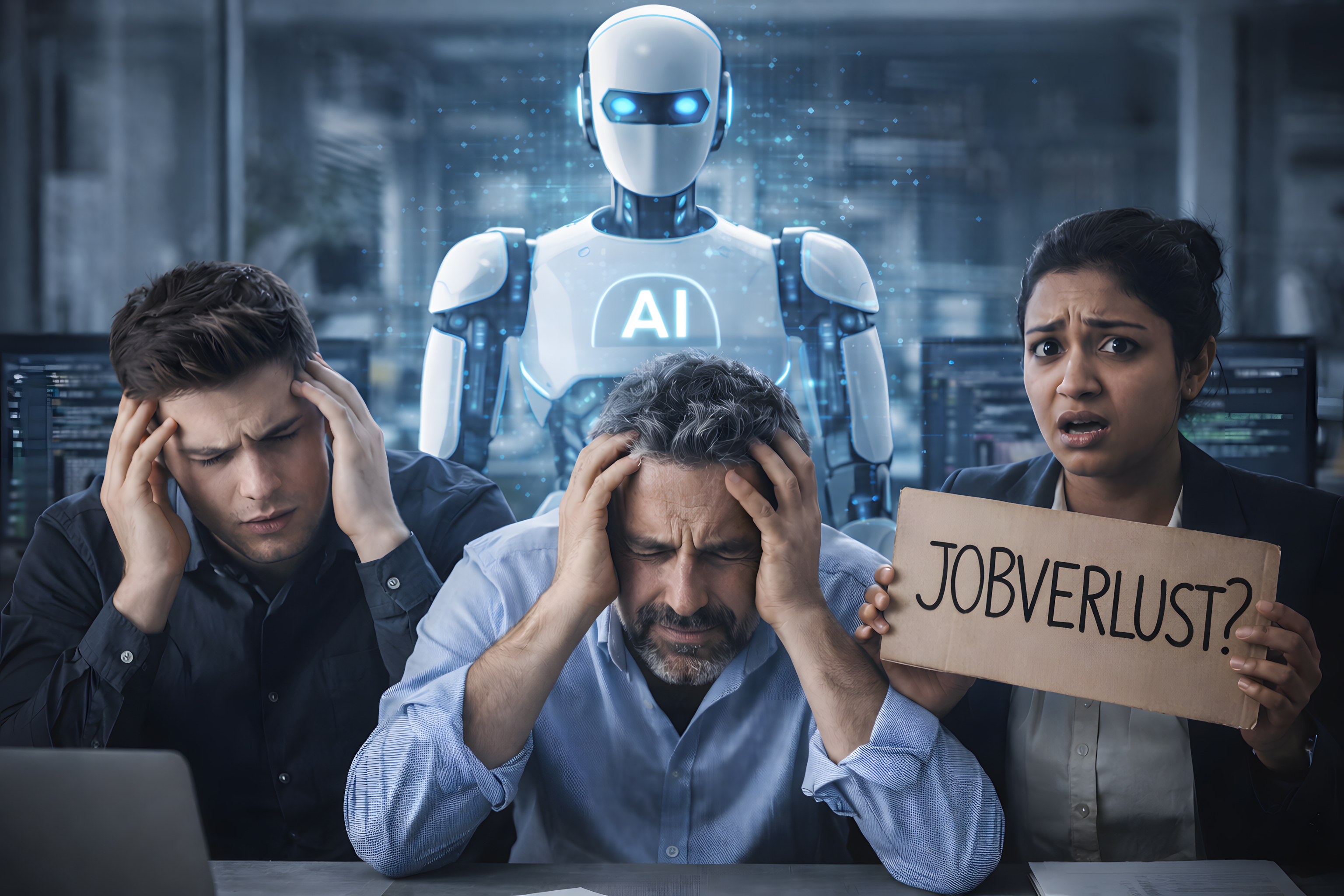 Dieses ausdrucksstarke Symbolbild zeigt drei sichtlich beunruhigte Büroangestellte – zwei Männer und eine Frau – die in einem modernen Büroumfeld sitzen. Zwei von ihnen halten sich die Hände an den Kopf, was Stress, Erschöpfung und Überforderung ausdrückt. Die Frau auf der rechten Seite hält ein Pappschild mit der deutschen Aufschrift «Jobverlust?» in die Kamera.