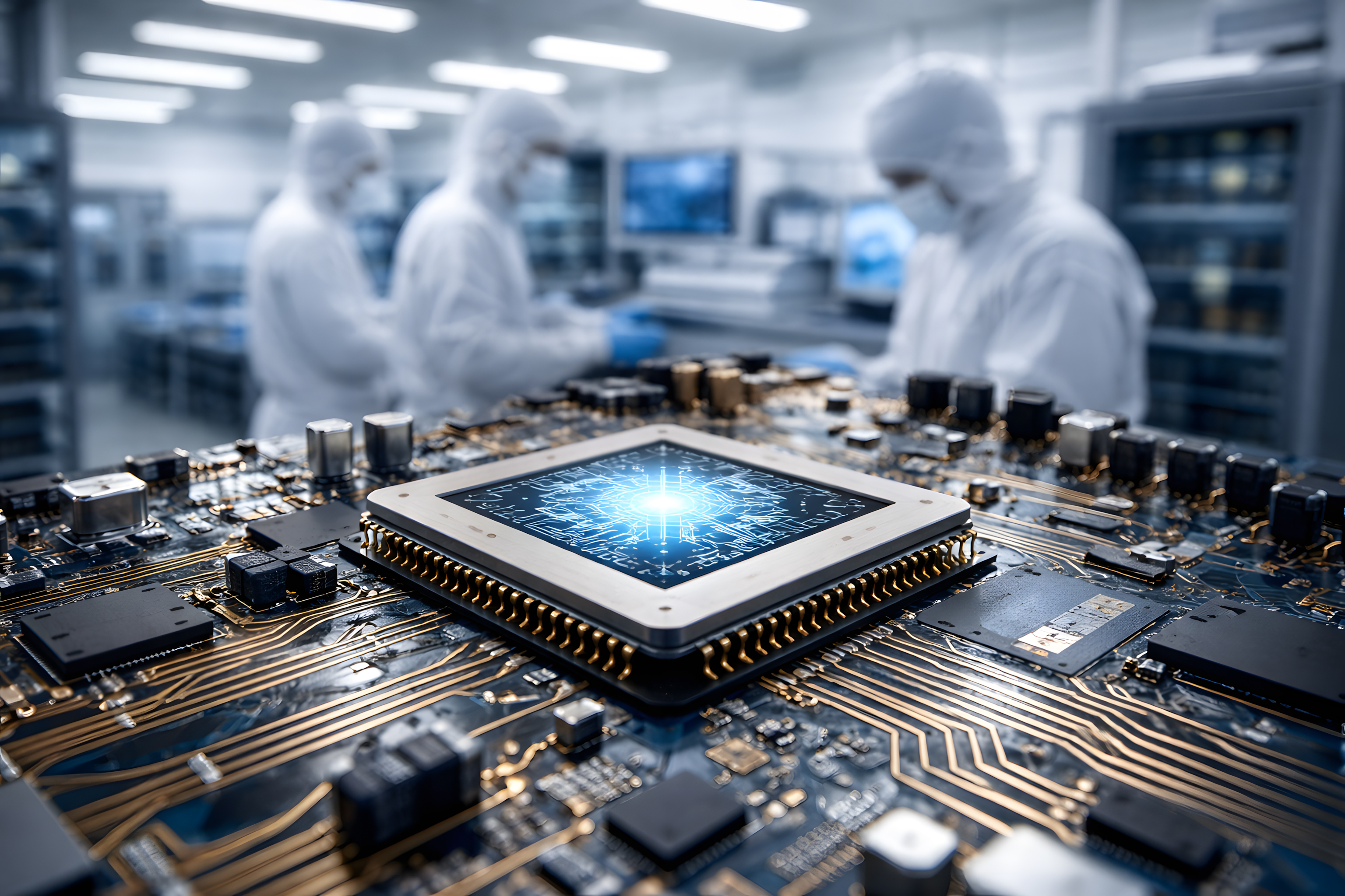 Im Hintergrund sind zwei Personen in weißen Reinraumanzügen und blauen Handschuhen zu erkennen, die in einem professionellen Elektroniklabor arbeiten. Die helle, sterile Umgebung unterstreicht den hochtechnologischen Charakter der Szene. Die Kombination aus scharfer Vordergrunddarstellung und weichem Hintergrundunschärfe-Effekt verleiht dem Bild eine beeindruckende Tiefenwirkung.