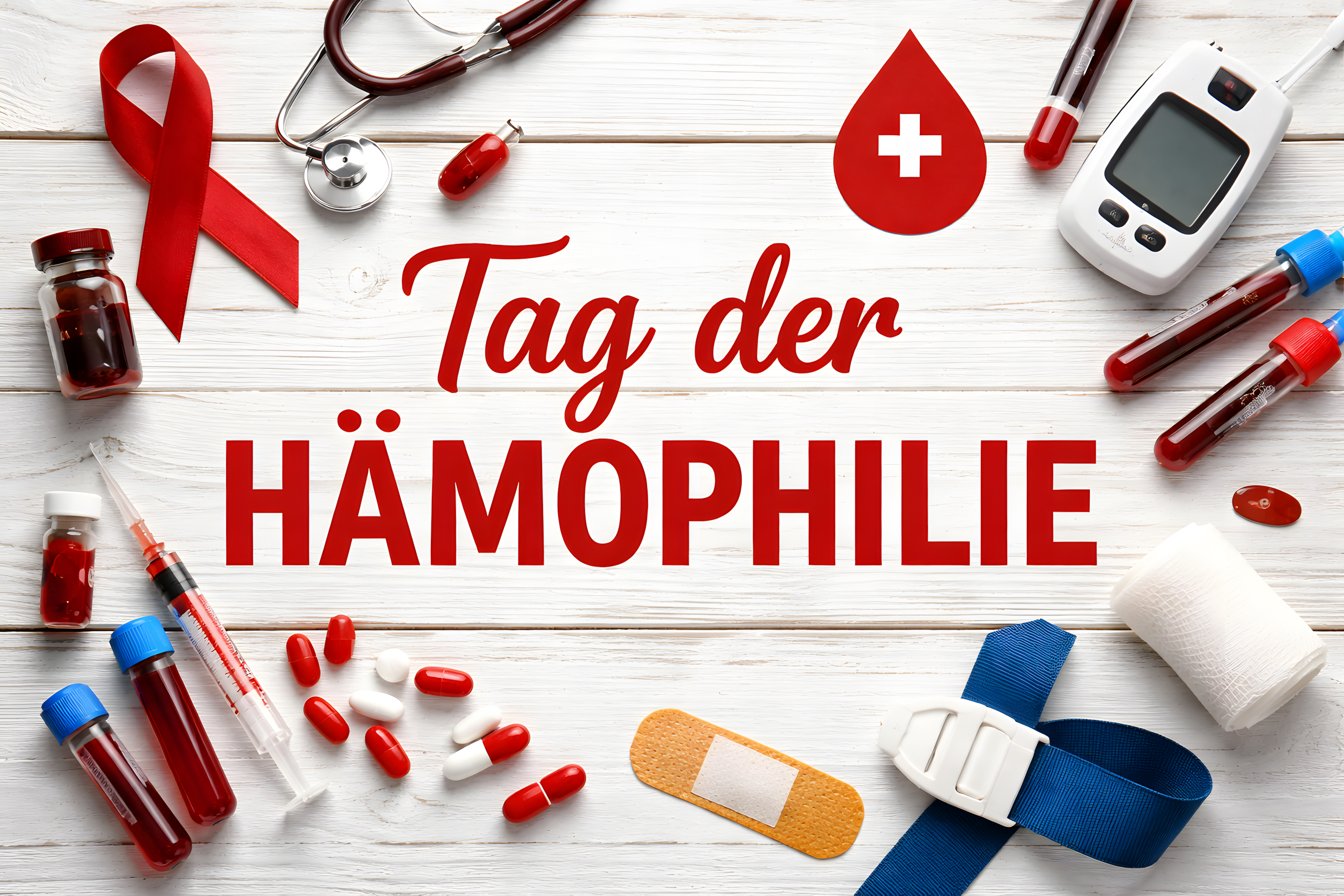 Dieses Bild zeigt eine sorgfältig arrangierte Flatlay-Komposition zum Thema Tag der Hämophilie. Im Mittelpunkt steht der in kräftigem Rot gehaltene Schriftzug «Tag der Hämophilie» auf einem hellen Holzhintergrund. Rund um den Text sind zahlreiche medizinische Gegenstände arrangiert: Reagenzgläser mit Blutproben, eine Spritze, ein Stethoskop, ein Blutzuckermessgerät, rote und weiße Tabletten, ein Pflaster, ein blaues Tourniquet sowie ein Verband.