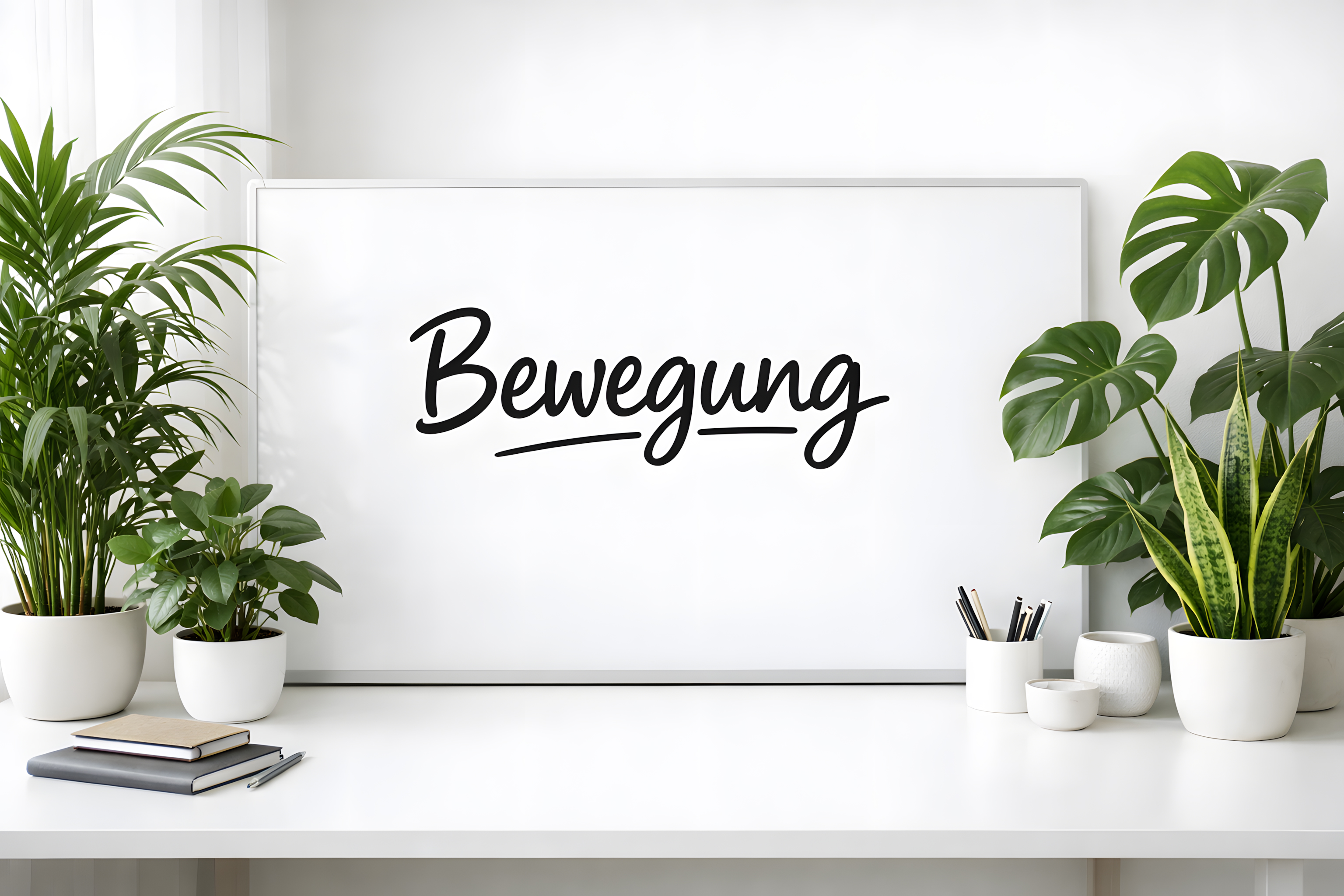 Dieses helle, aufgeräumte Foto zeigt ein weißes Whiteboard, das zentral auf einem modernen Schreibtisch platziert ist. Darauf steht in eleganter schwarzer Handschrift der deutsche Begriff «Bewegung», unterstrichen mit einem schwungvollen Strich. Das Wort wirkt wie ein motivierendes Motto oder ein Lerninhalt.