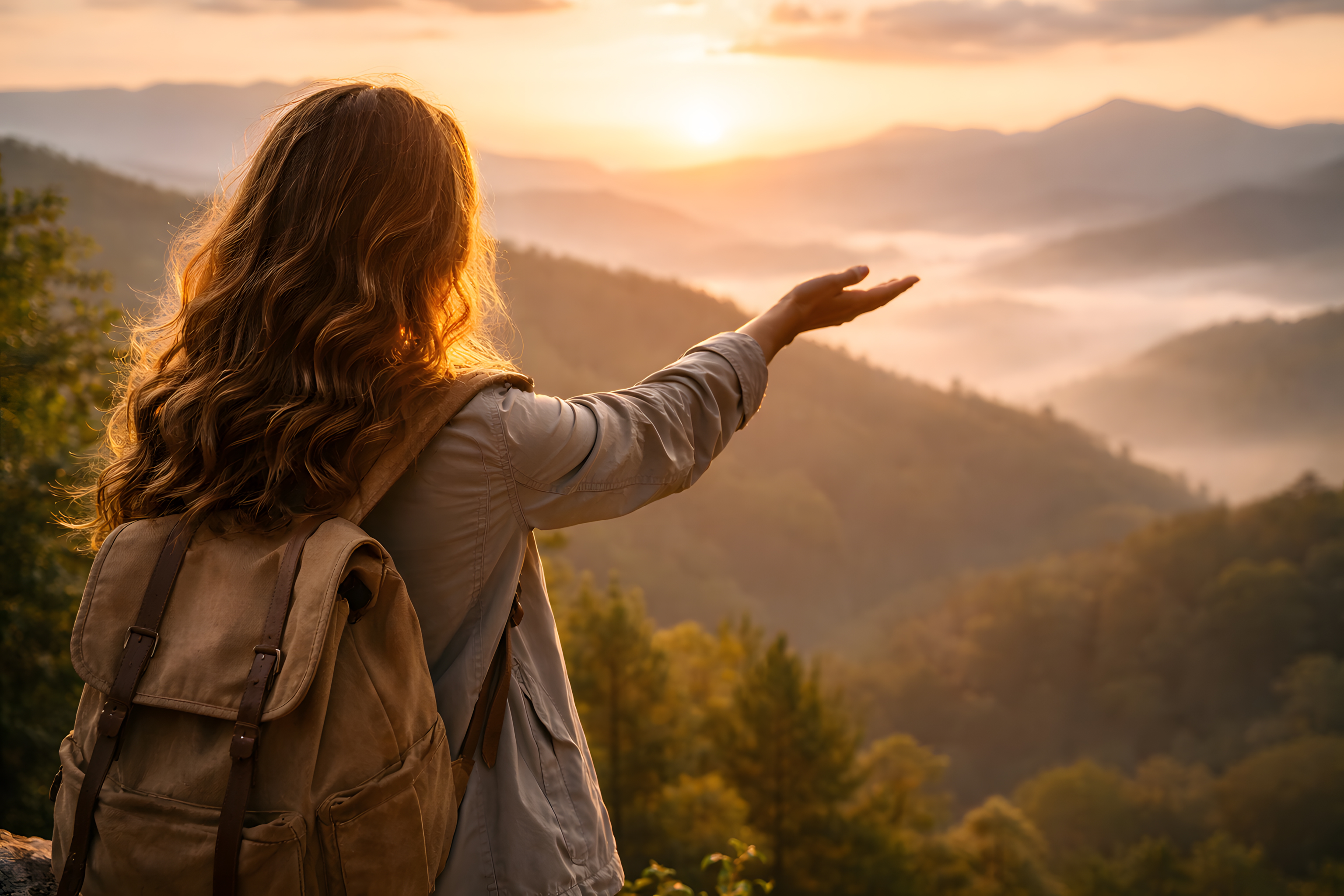 Im Hintergrund erstreckt sich ein sanft gewelltes Bergpanorama, das von dichten Wäldern bedeckt ist. Zwischen den Bergrücken liegt zartes Morgennebel, das dem Bild eine märchenhafte Tiefe verleiht. Die Sonne steht tief am Horizont und taucht die gesamte Szene in ein warmes, goldenes Licht mit orange-gelben Farbtönen. Das Haar der Frau leuchtet im Gegenlicht und unterstreicht die romantische Atmosphäre.