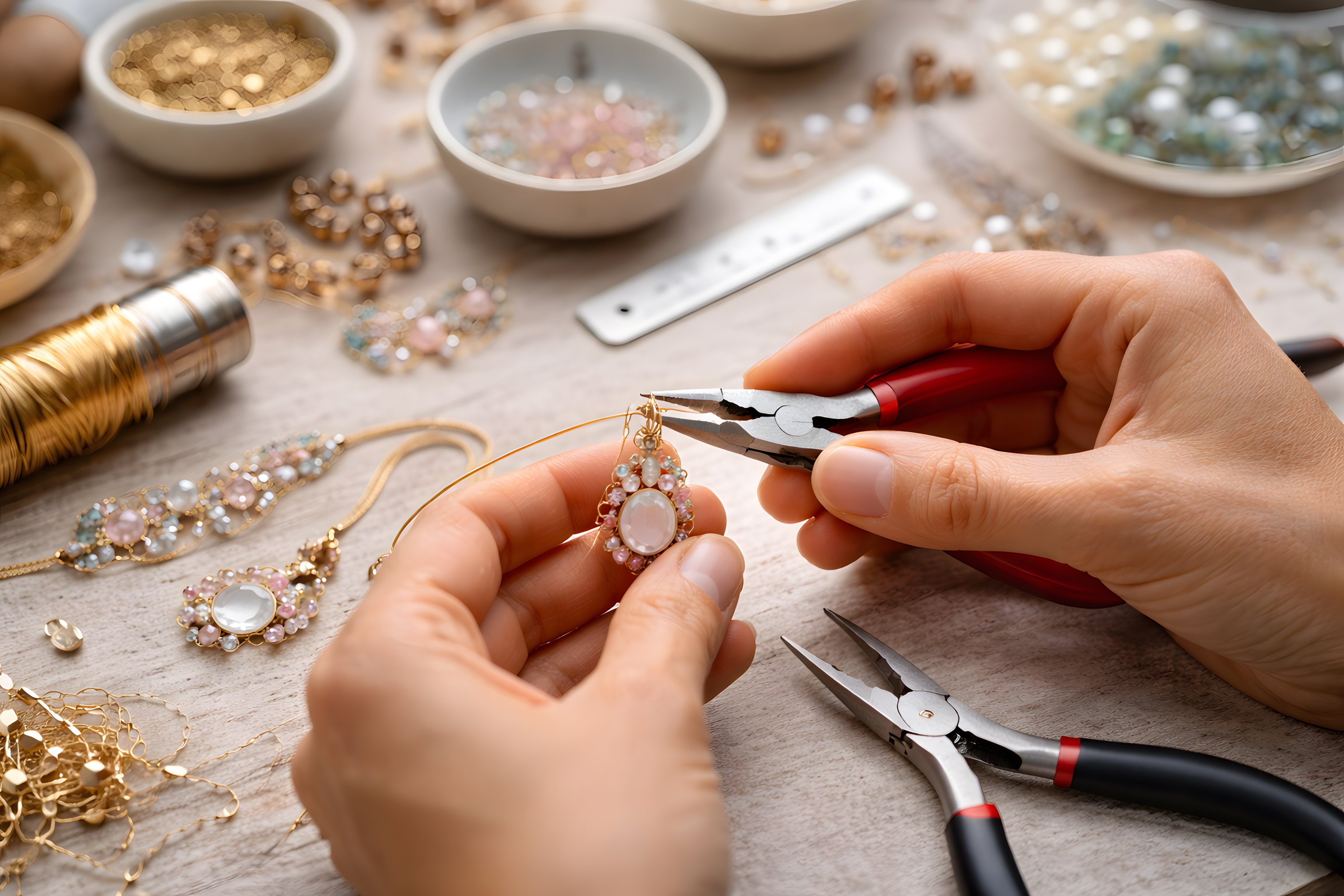 Diese Nahaufnahme zeigt zwei Hände beim sorgfältigen Zusammensetzen eines filigranen Ohrhangers. Mit einer rotgriffigen Zange wird ein goldener Draht an einem kunstvoll gestalteten Schmuckstück aus rosafarbenen Perlen und kleinen Kristallen bearbeitet. Das Schmuckstück liegt zwischen den Fingern und zeigt einen ovalen Stein in zartem Rosé, umrahmt von kleinen bunten Perlen in Pastell- und Goldtönen.