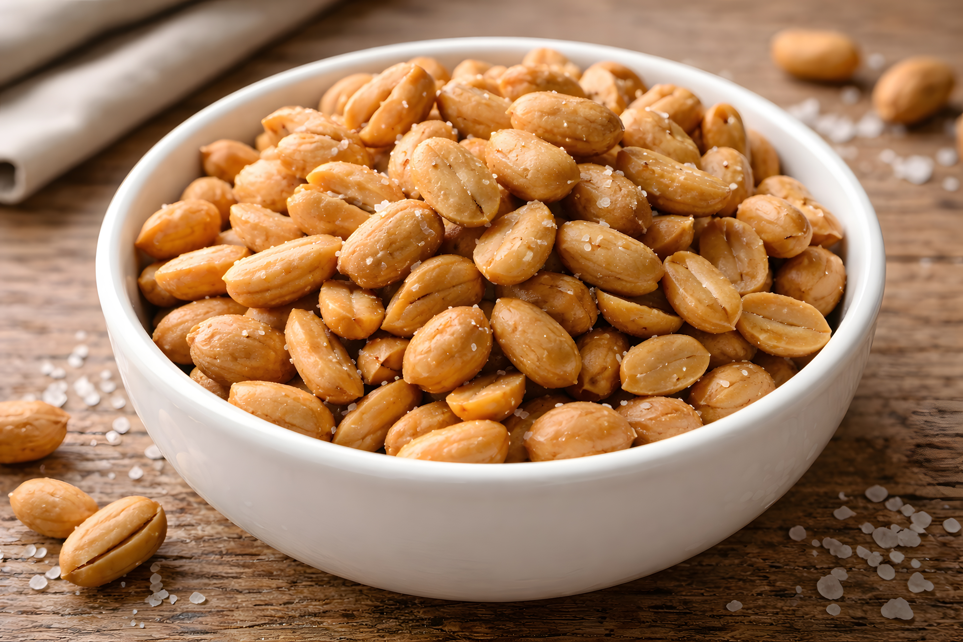 Das Foto zeigt eine großzügig gefüllte weiße Keramikschüssel mit gerösteten und gesalzenen Erdnüssen. Die Erdnüsse haben eine warme, goldbraune Färbung und sind mit feinen Meersalzkristallen bestreut, die im Licht leicht glänzen. Einige Nüsse liegen malerisch auf dem rustikalen Holztisch verteilt, zusammen mit vereinzelten Salzkristallen.