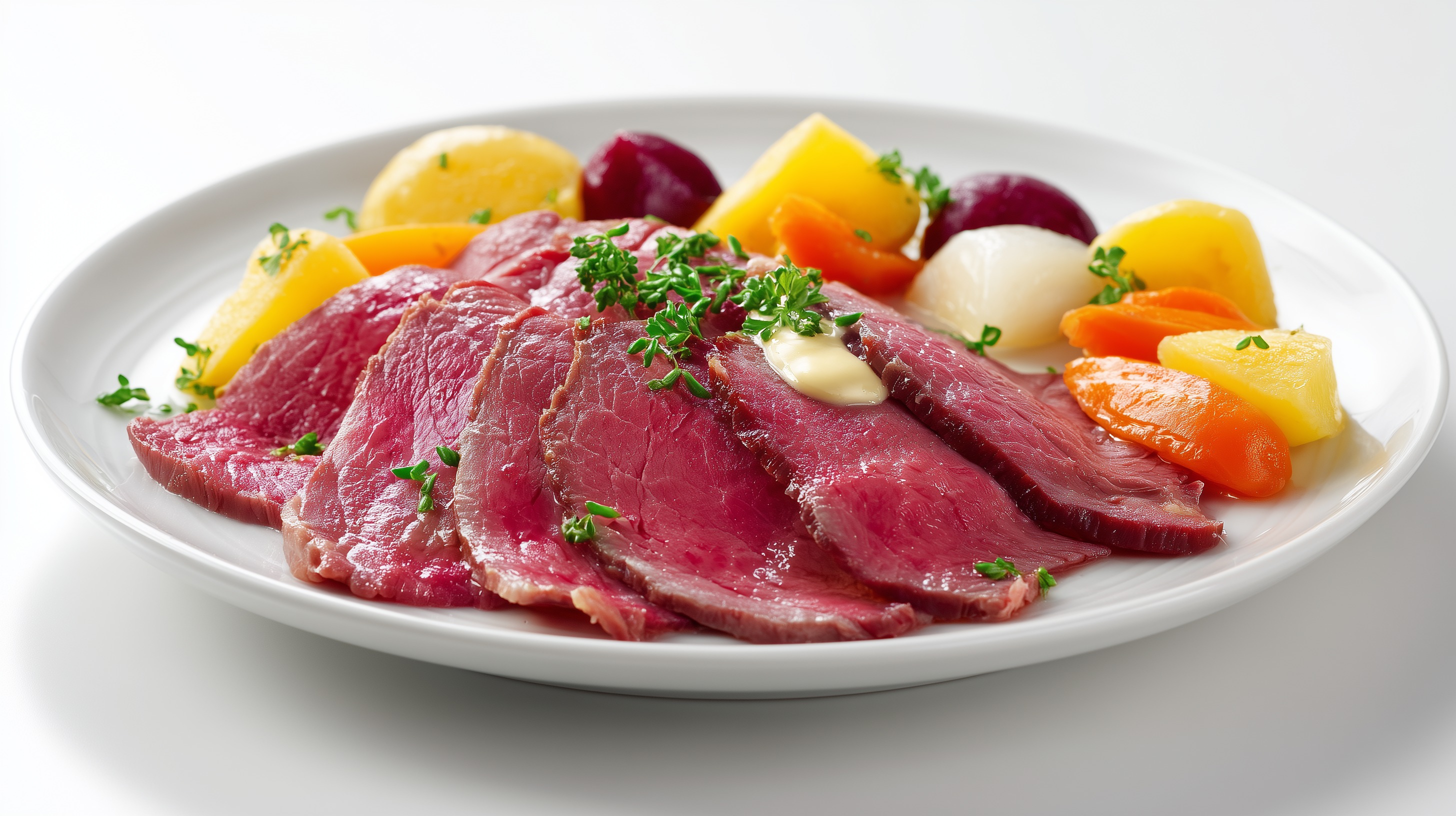 - Die Fleischscheiben auf vorgewärmten weißen Tellern anrichten. Das gegarte Gemüse und die Kartoffeln daneben platzieren. Einen Klecks Meerrettichsauce auf das Fleisch geben.