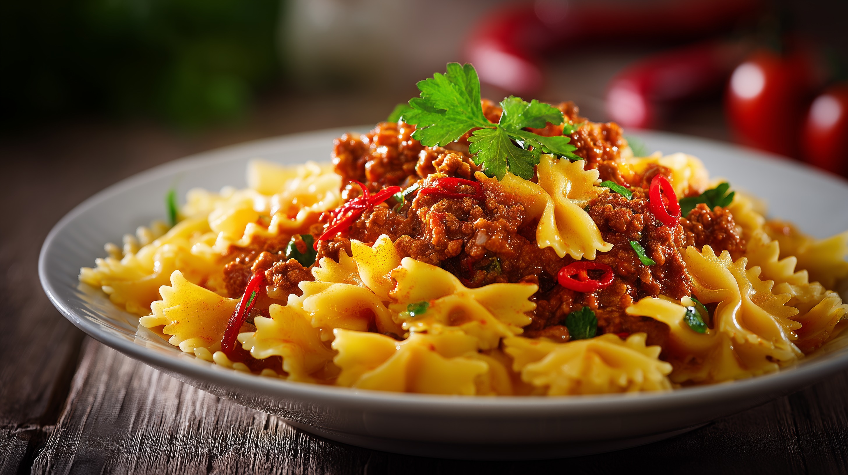- Die abgegossenen Farfalle direkt in die Hackfleischsauce geben und gut unterheben. Bei Bedarf etwas aufgefangenes Nudelwasser hinzufügen, damit die Sauce schön cremig die Nudeln umhüllt.