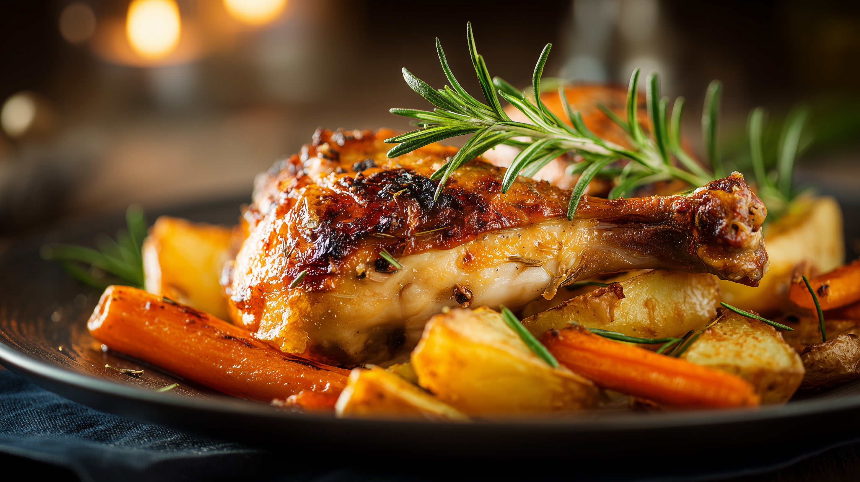 - Die Keulen kurz ruhen lassen, dann zusammen mit dem Gemüse auf Tellern anrichten und mit frischem Rosmarin garniert servieren.