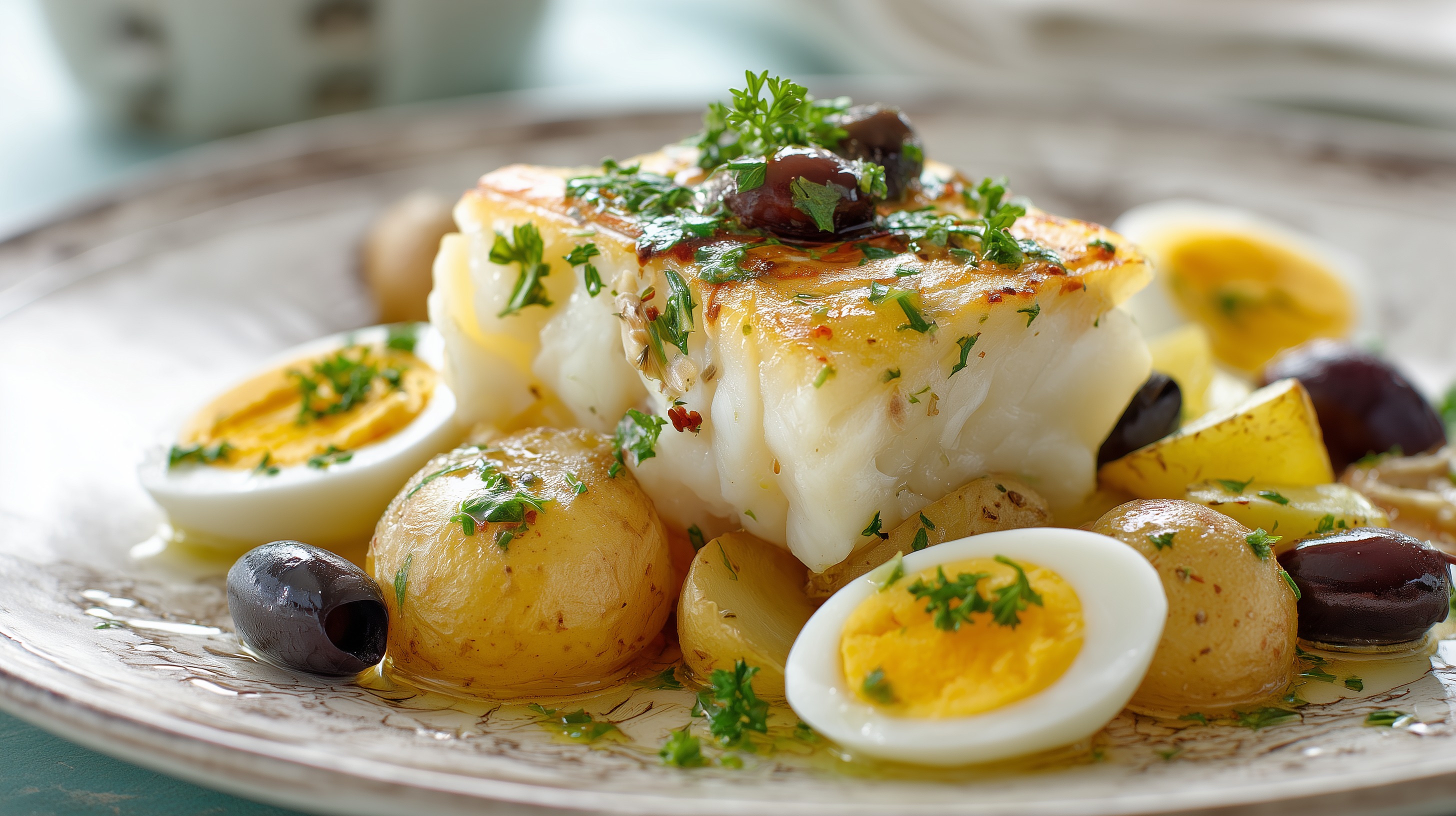 - Fertigstellen: Den Bacalhau-Eintopf auf Tellern anrichten. Die halbierten Eier und die Oliven darüber verteilen. Mit dem restlichen Olivenöl beträufeln und großzügig mit frischer Petersilie bestreuen. Sofort servieren.