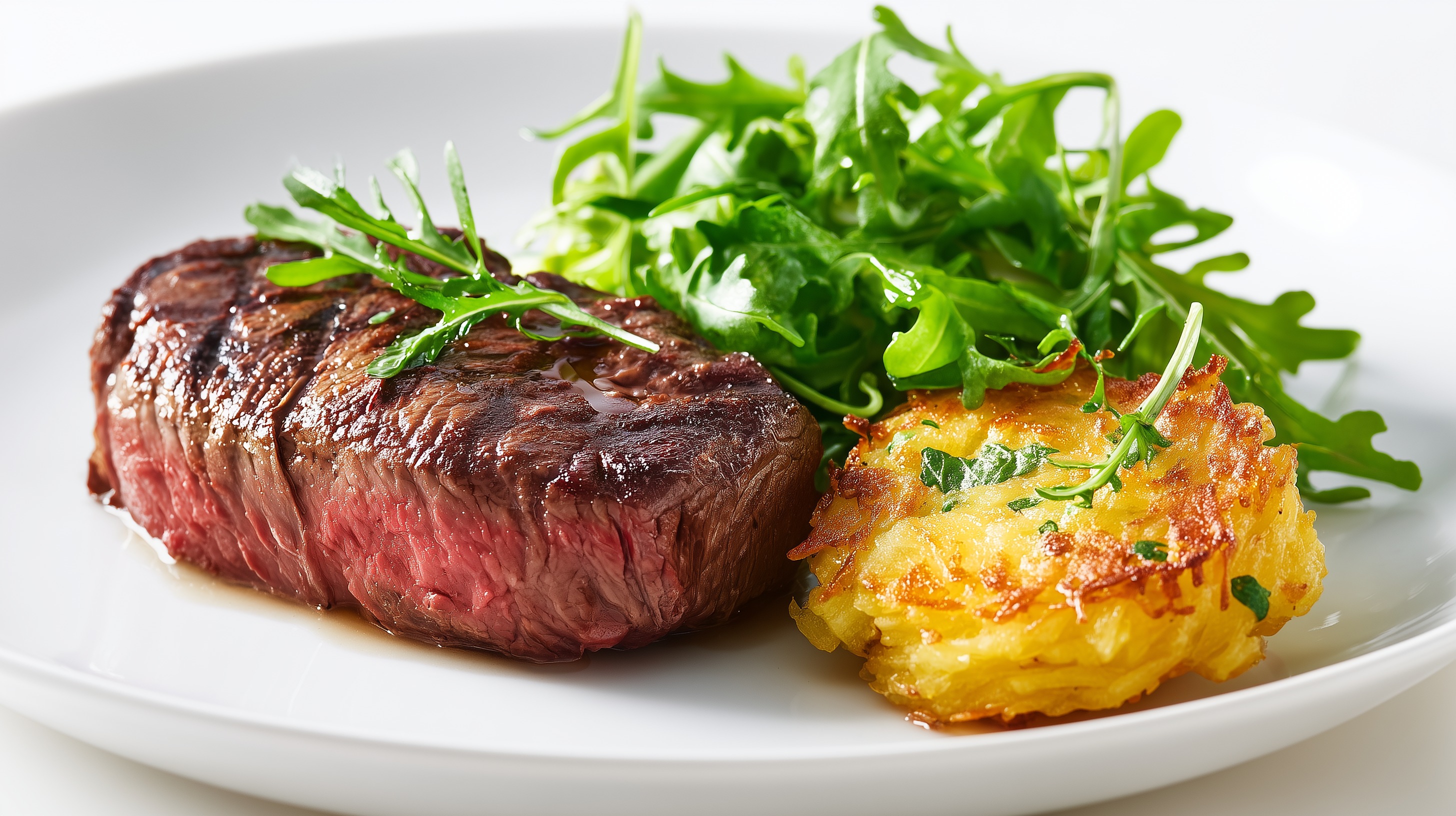- Je ein Steak mit 2 Kartoffelplätzchen und einem Häufchen Rucola auf vorgewärmten Tellern anrichten und sofort servieren.
