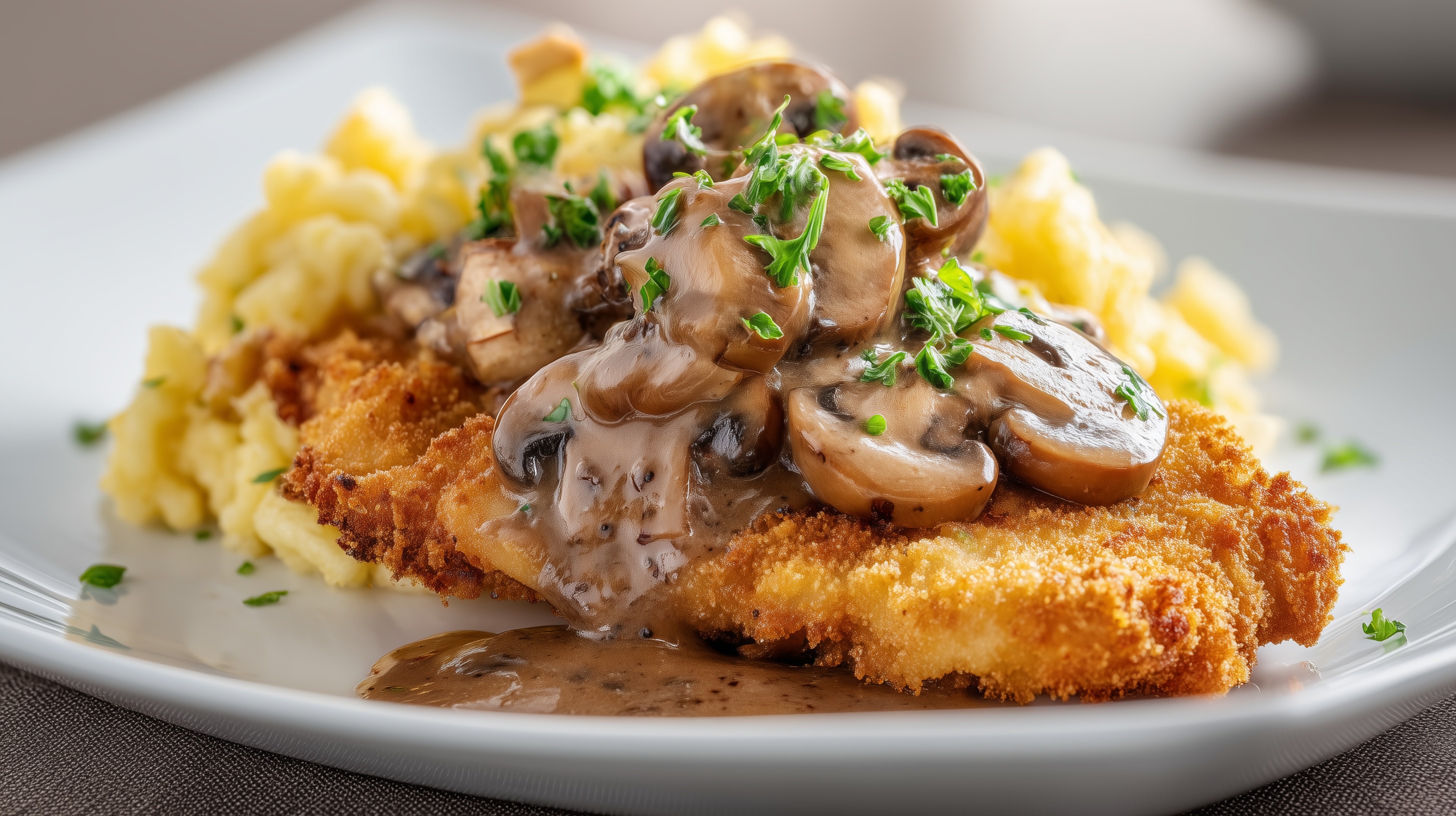 - Schnitzel auf vorgewärmten Tellern anrichten, großzügig mit Pilzsoße übergießen, Kartoffelpüree dazugeben und alles mit frischer Petersilie bestreuen.