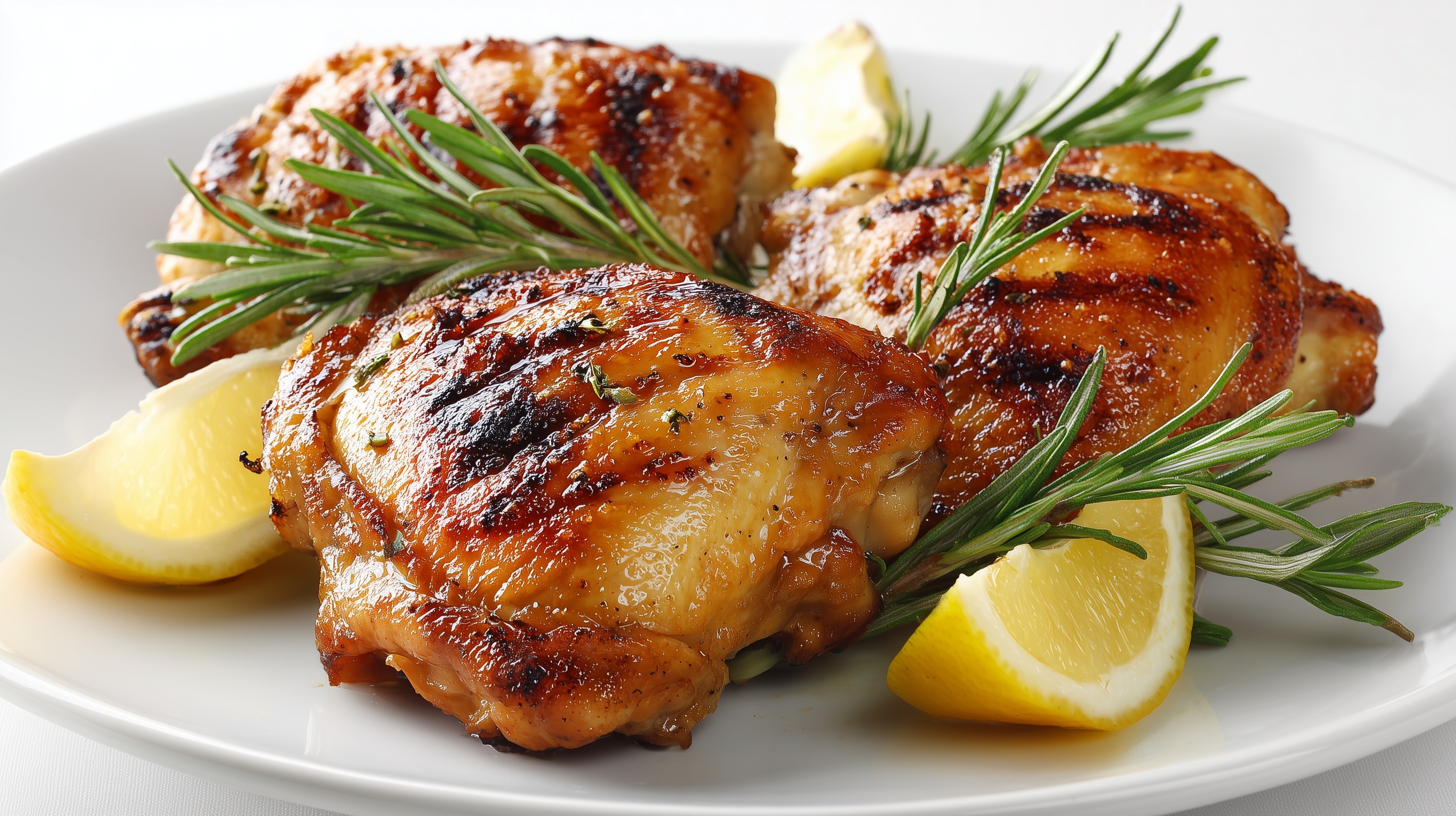 - Die gegrillten Hühnchenschenkel kurz ruhen lassen, dann auf einem Teller anrichten. Mit den restlichen frischen Rosmarinzweigen und den Zitronenspalten dekorieren und sofort servieren.
