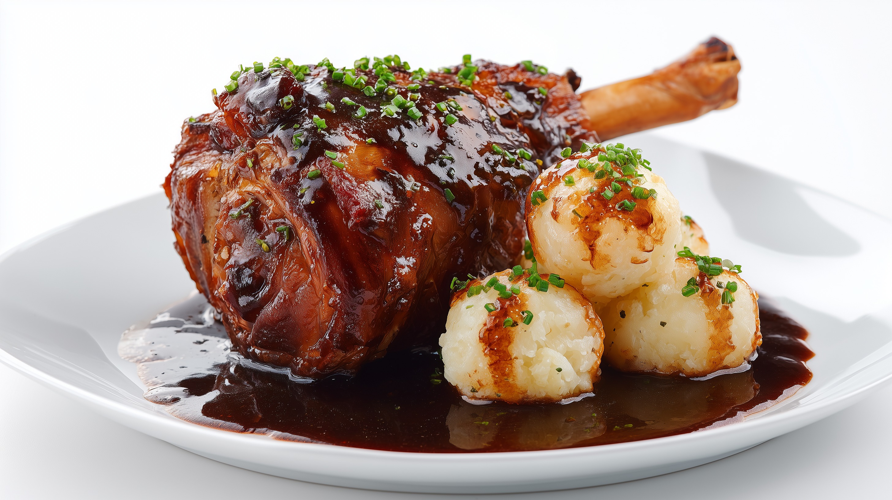 - Jeweils eine halbe Haxe mit 2 Knödeln auf einem tiefen Teller anrichten, großzügig mit der dunklen Soße übergießen und mit Schnittlauch garnieren. Sofort servieren.