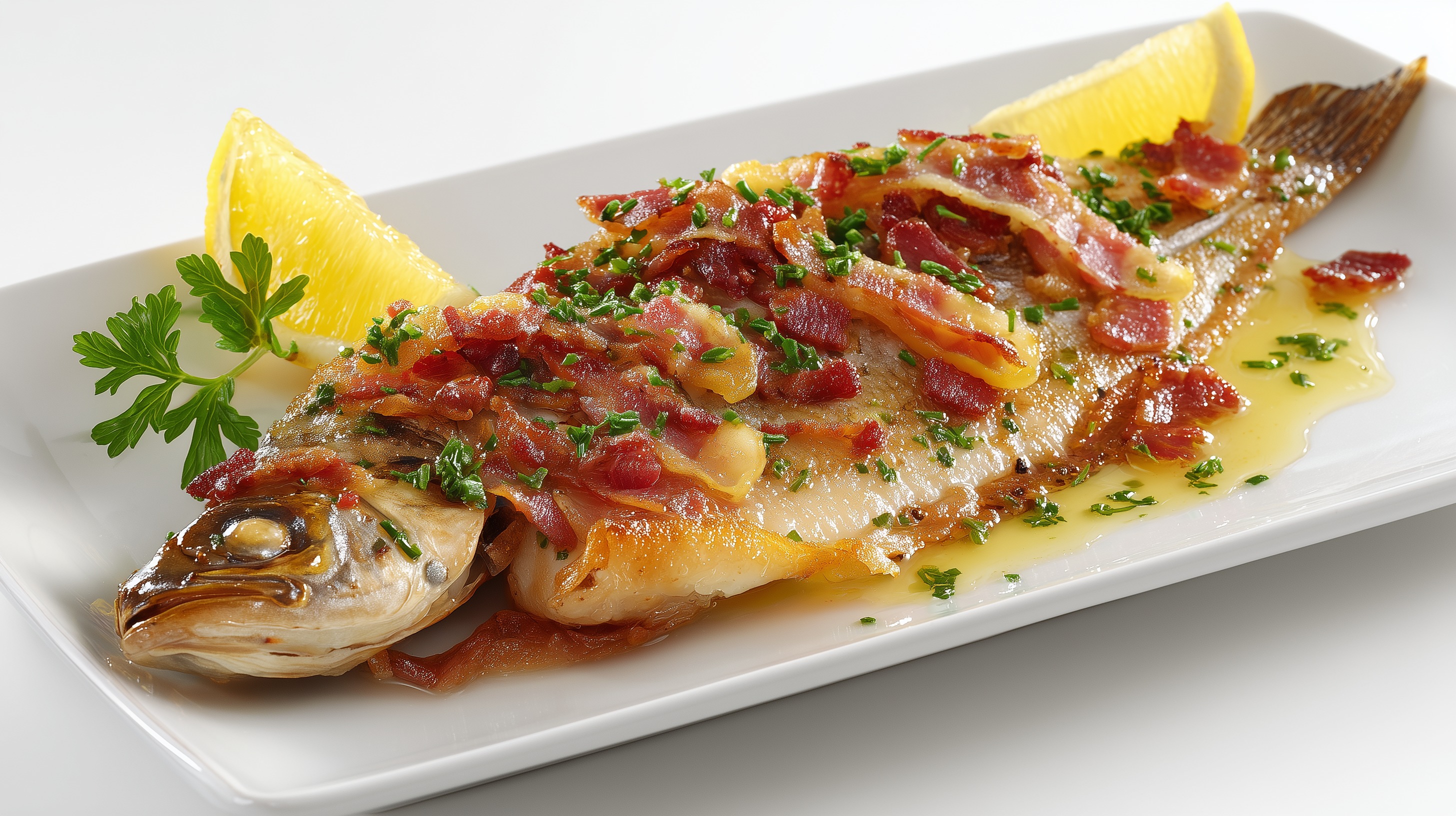 - Die gebratenen Schollen auf einem weißen Teller anrichten. Den knusprigen Speck großzügig über die Fische verteilen. Die Nussbutter darüberträufeln und mit Schnittlauch sowie Petersilie bestreuen.