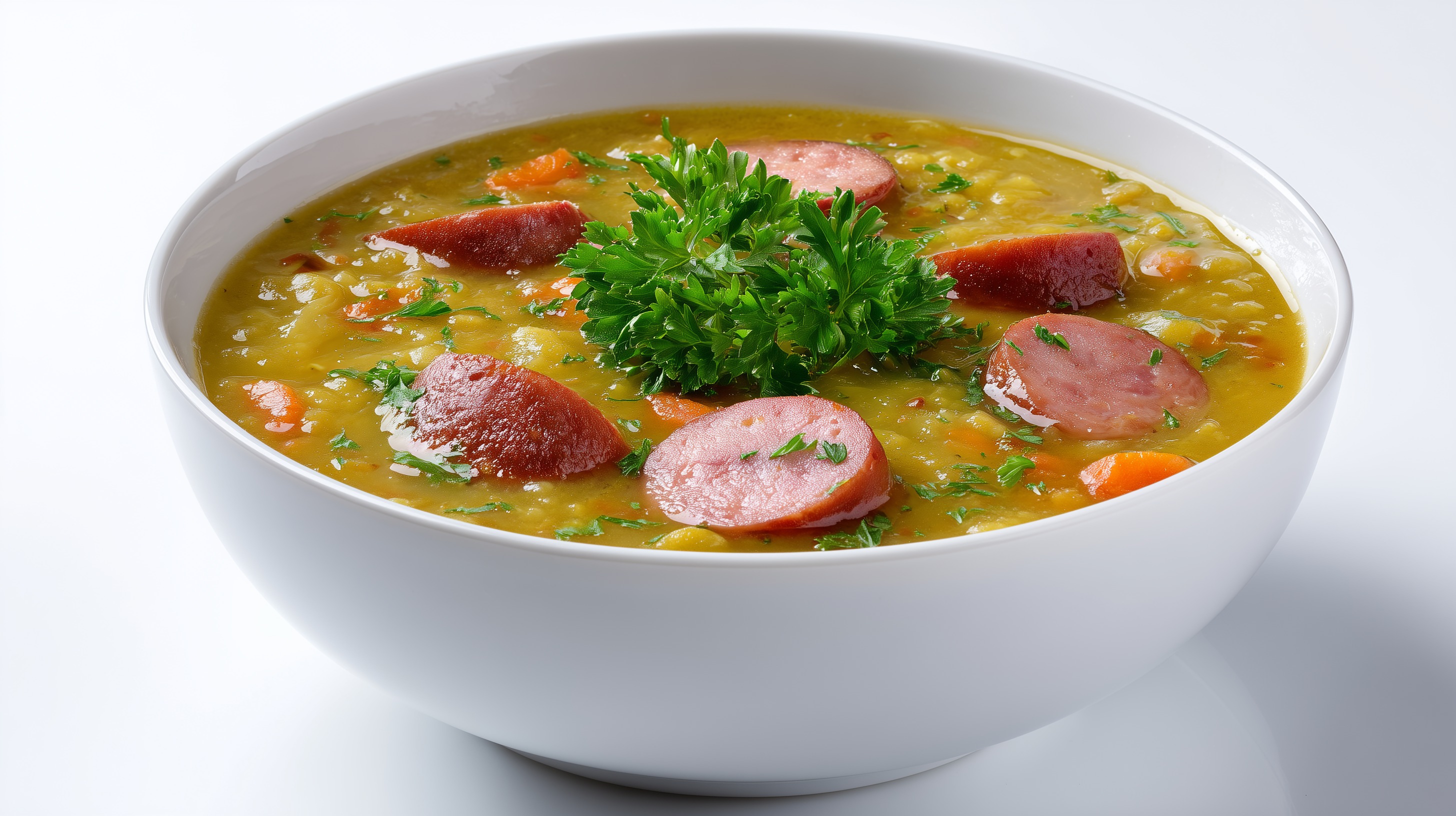 Tipp: Wer es rauchiger mag, gibt ein Stück geräucherten Speck oder eine Scheibe Kasseler mit in den Topf und kocht es zusammen mit den Erbsen. Vor dem Servieren einfach herausnehmen und in Stücke schneiden. Die Suppe schmeckt am nächsten Tag aufgewärmt noch besser!