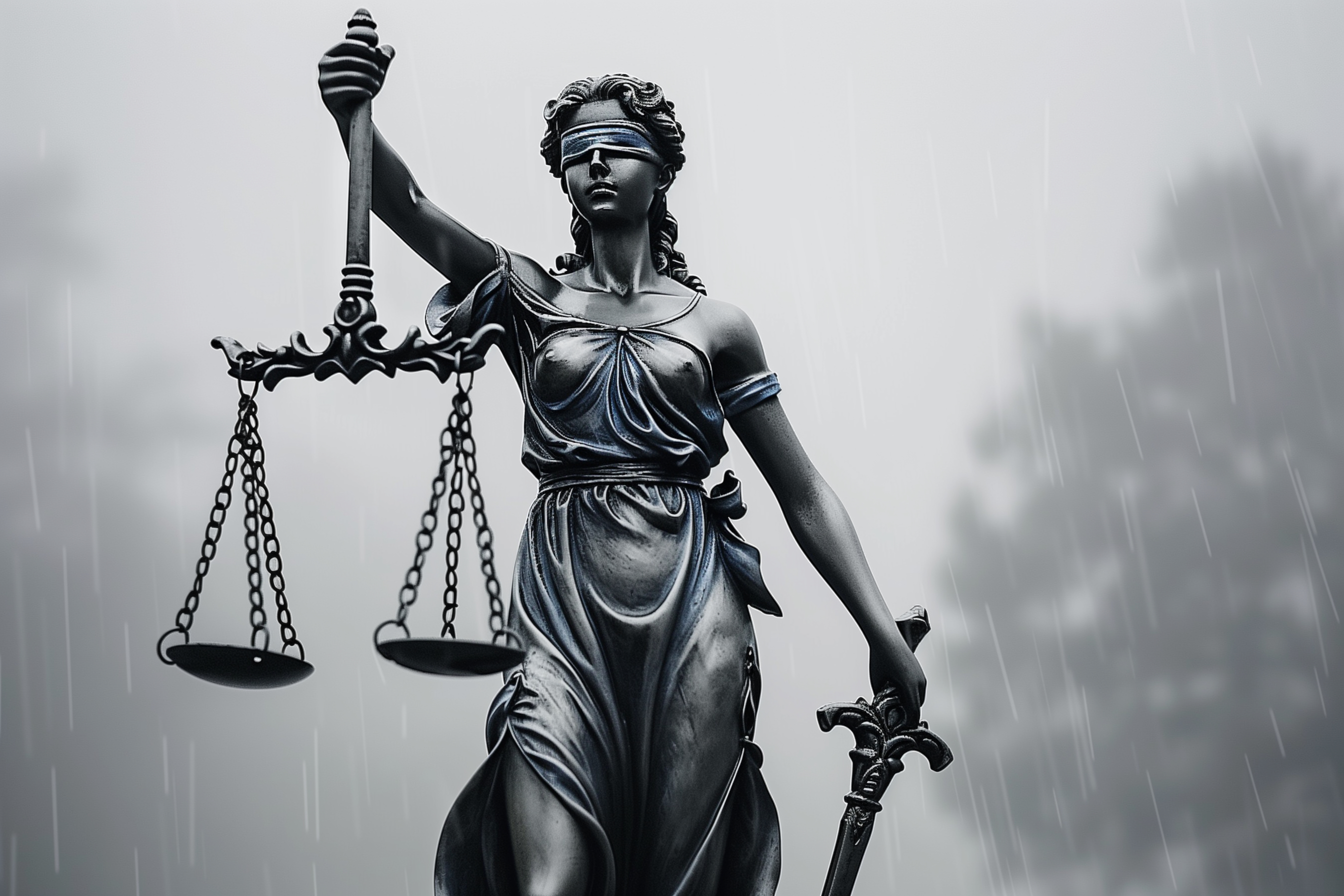 Das Bild zeigt die klassische Statue der römischen Göttin der Gerechtigkeit, Justitia, vor einem grauen, regnerischen Hintergrund. Die Statue ist in einer dramatischen Schwarz-Weiß-Fotografie festgehalten, die ihr eine ernsthafte, erhabene Ausstrahlung verleiht. Die Göttin hält die traditionellen Symbole ihrer Aufgabe - Waage und Schwert - in den Händen und trägt einen wehenden Umhang. Das Foto eignet sich hervorragend als Titelbild oder Hintergrundfoto für Beiträge zu Themen wie Recht, Gerechtigkeit, Rechtsprechung oder Gerichtsverhandlungen. Dieses kostenlose, hochauflösende Stockfoto steht unter einer Creative-Commons-Lizenz zur Verfügung.