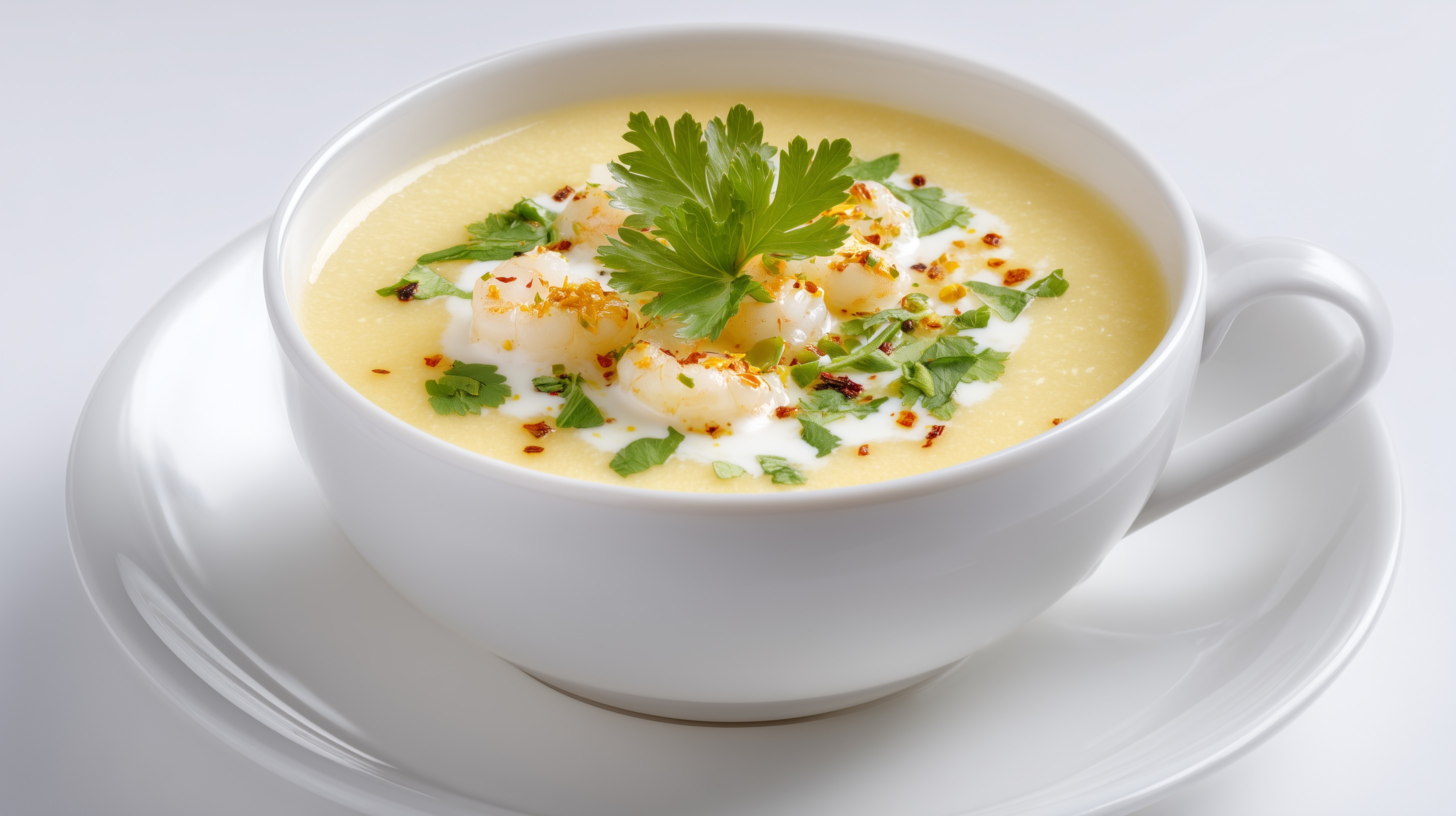 - Die Suppe in vier vorgewärmte Tassen oder Schüsseln füllen. Je einen Klecks Crème fraîche in die Mitte geben, die gebratenen Garnelen darauflegen und mit Koriander oder Petersilie, Frühlingszwiebeln und etwas Chiliflocken garnieren. Sofort servieren.