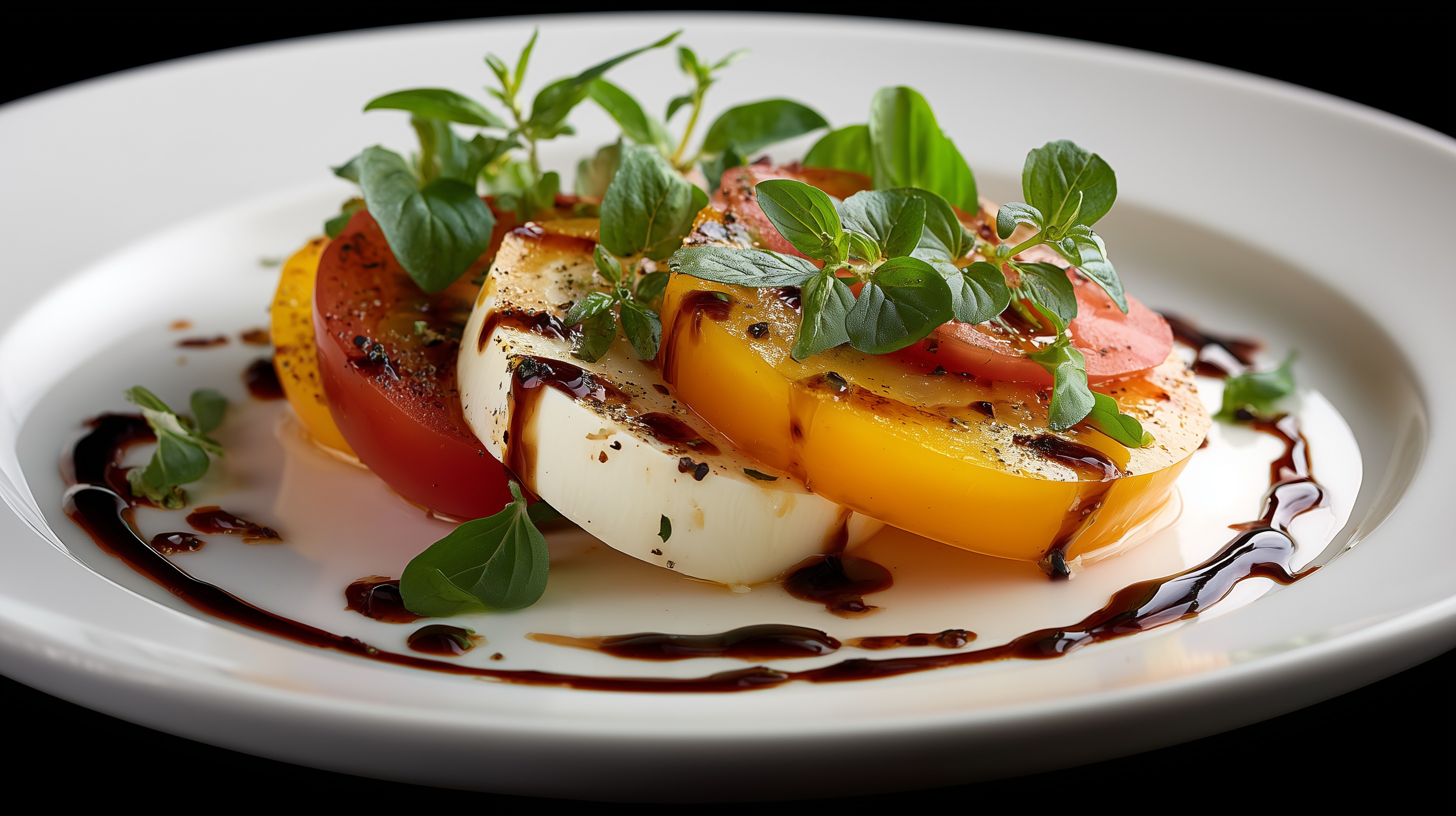 - Die Balsamico-Reduktion in eleganten Bögen oder Tropfen um und über das Caprese verteilen.