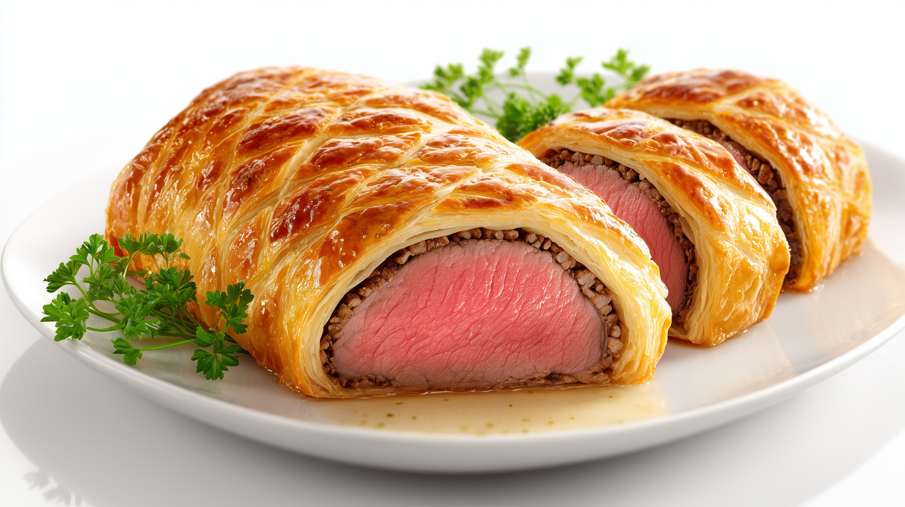- Ruhen und Servieren: Das Beef Wellington aus dem Ofen nehmen und unbedingt 5–8 Minuten ruhen lassen, bevor es mit einem scharfen Messer in Scheiben geschnitten wird. Auf einem weißen Teller anrichten und mit frischer Petersilie garnieren.