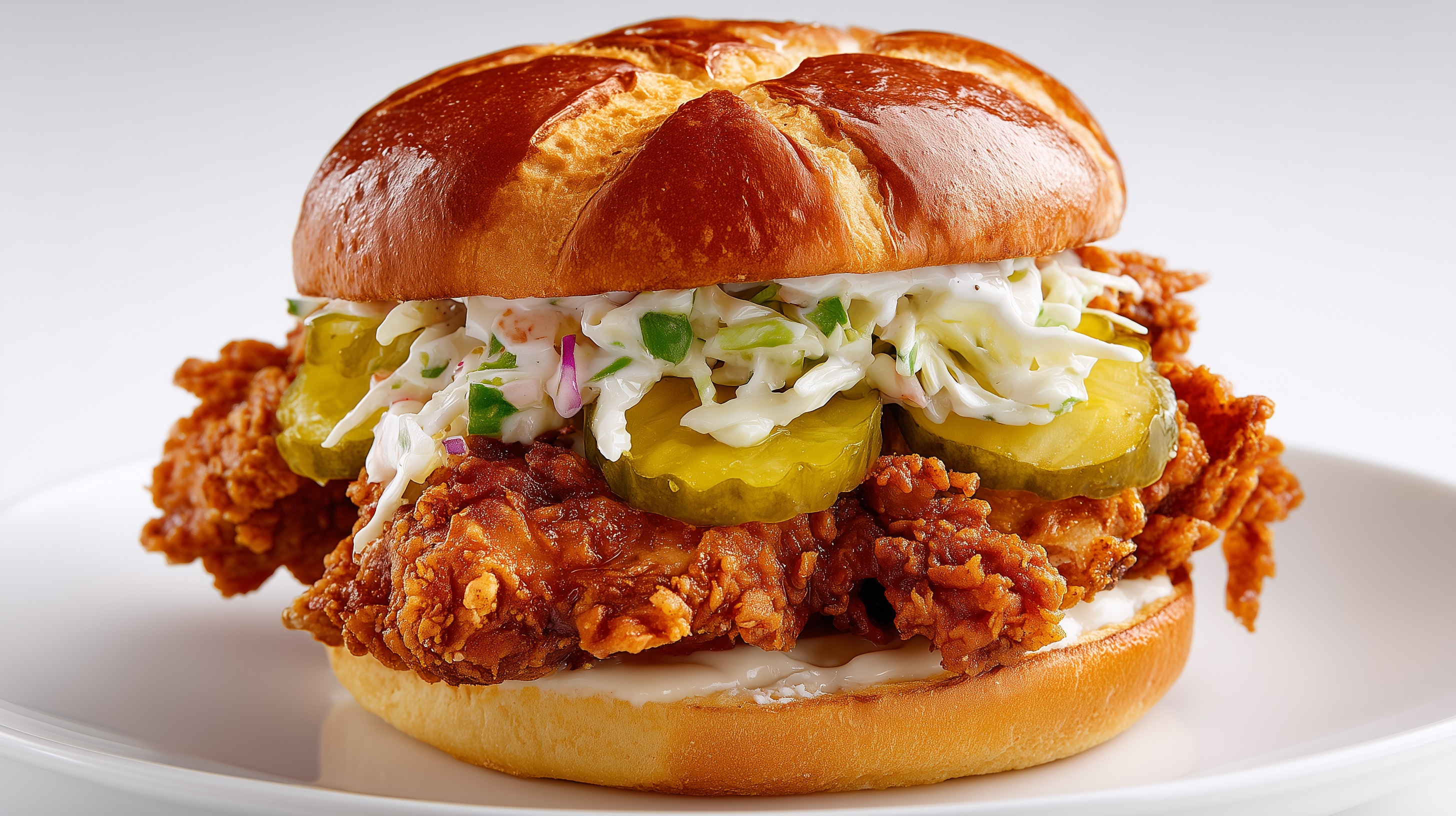- Sandwich zusammensetzen: Die untere Bun-Hälfte mit der Honig-Senf-Sauce bestreichen. Das frittierte Hähnchenfilet darauflegen, anschließend die Pickle-Scheiben und großzügig Coleslaw daraufgeben. Den Bun-Deckel aufsetzen und sofort servieren.
