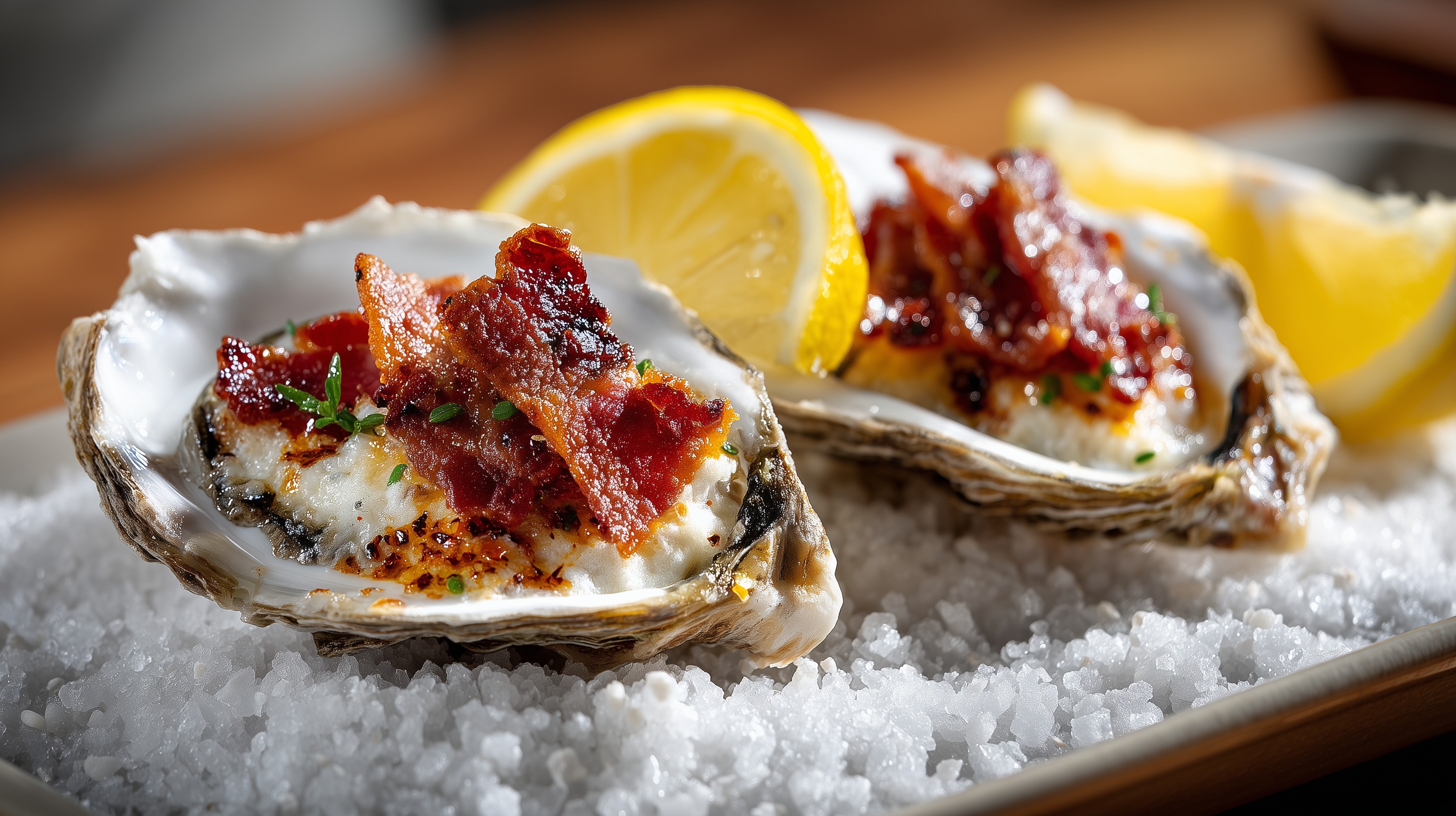Tipp: Bitten Sie Ihren Fischhändler, die Austern frisch zu öffnen – so sparen Sie Zeit und Aufwand. Wer es etwas rauchiger mag, kann den Speck durch geräucherten Schwarzwälder Speck ersetzen. Das Salzbett lässt sich mehrfach verwenden und hält die Austern während des Servierens angenehm warm.