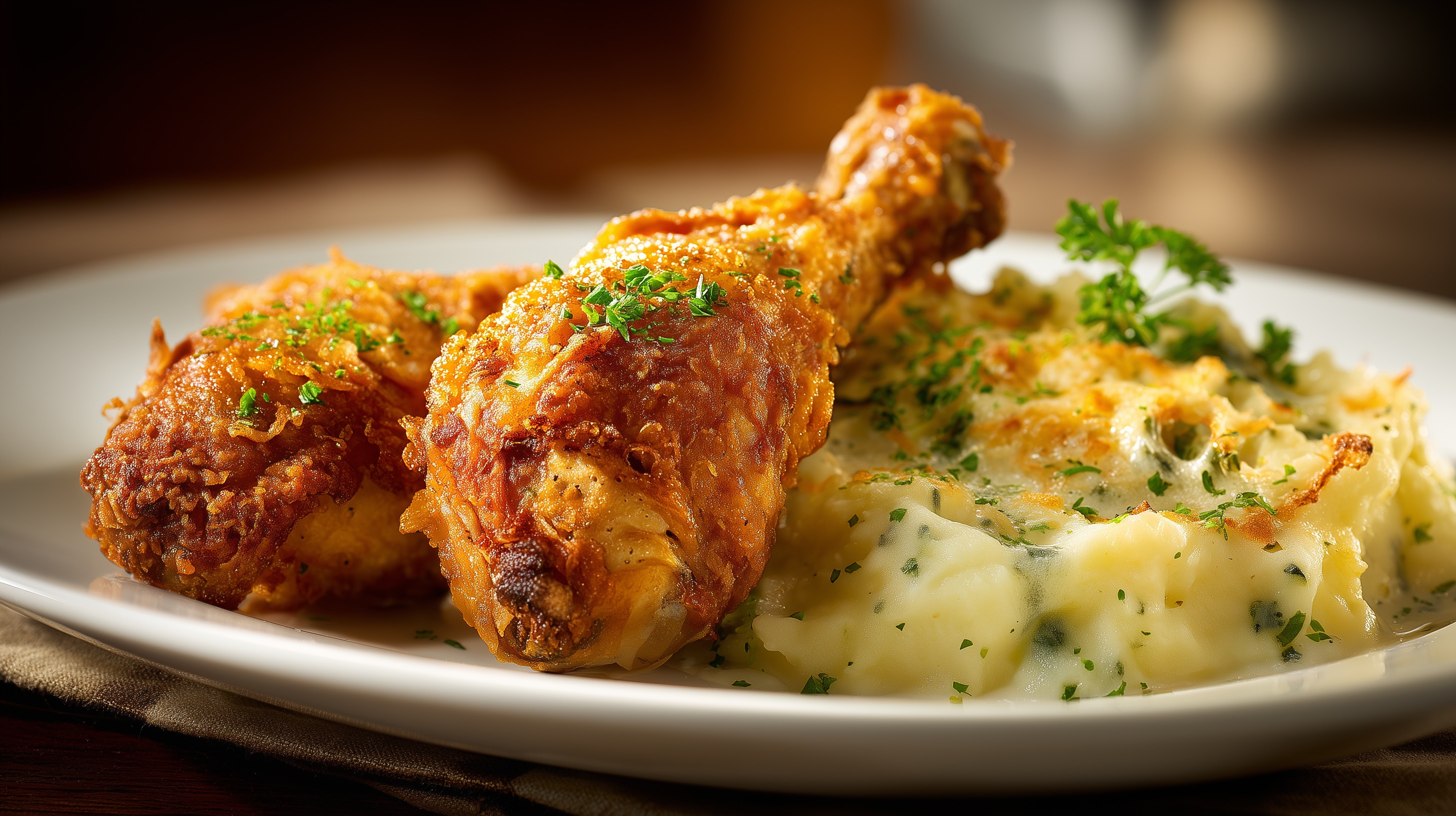 - Anrichten: Je zwei Backhendl-Keulen mit einer großzügigen Portion Kartoffelauflauf auf einem weißen Teller anrichten. Mit frisch gehackter Petersilie garnieren und sofort servieren.