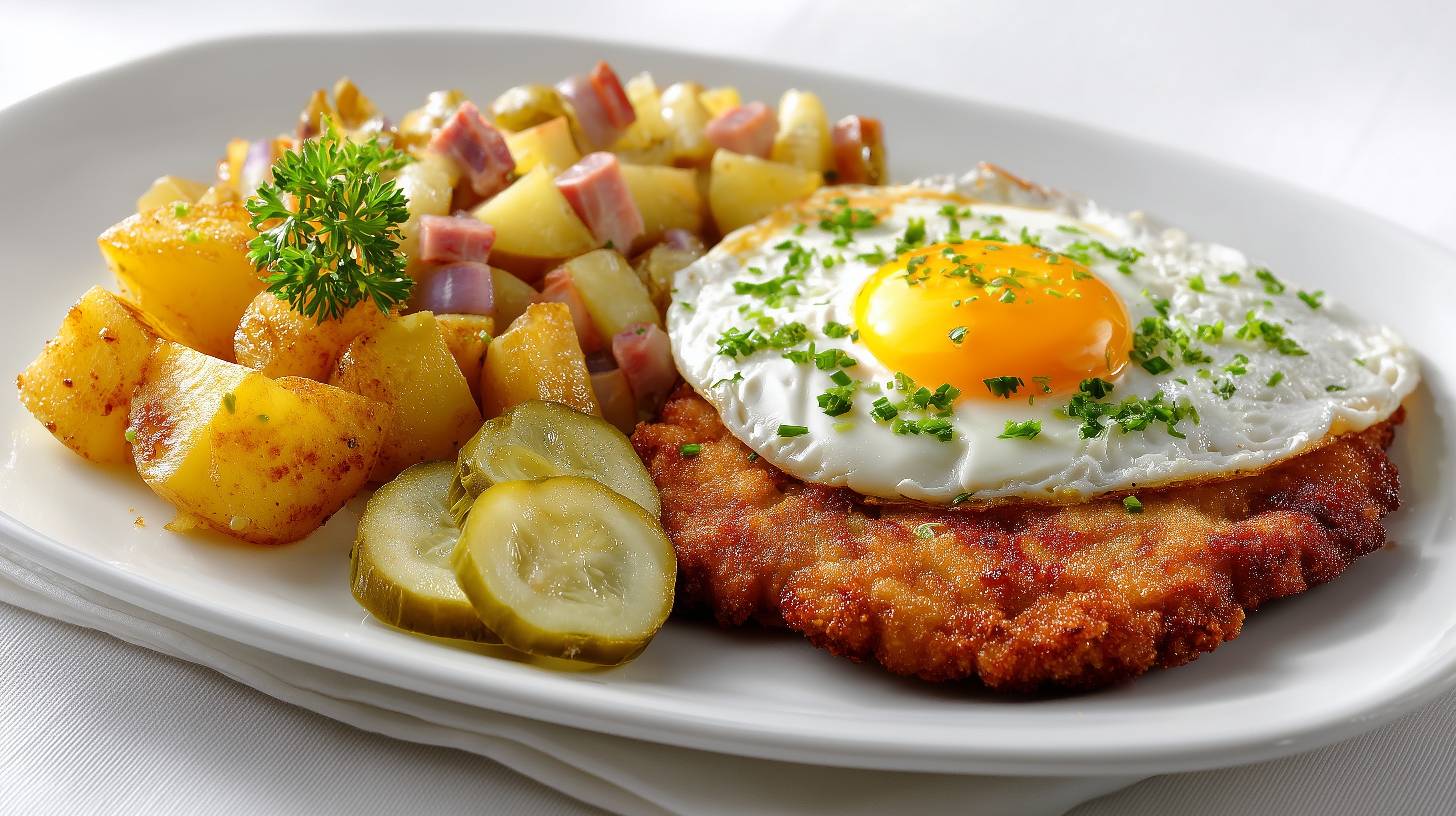 - Je ein Schnitzel auf einem vorgewärmten Teller anrichten, das Spiegelei daraufsetzen, Bratkartoffeln danebenlegen, Gewürzgurkenscheiben dazugeben und mit Petersilie garnieren. Sofort servieren.