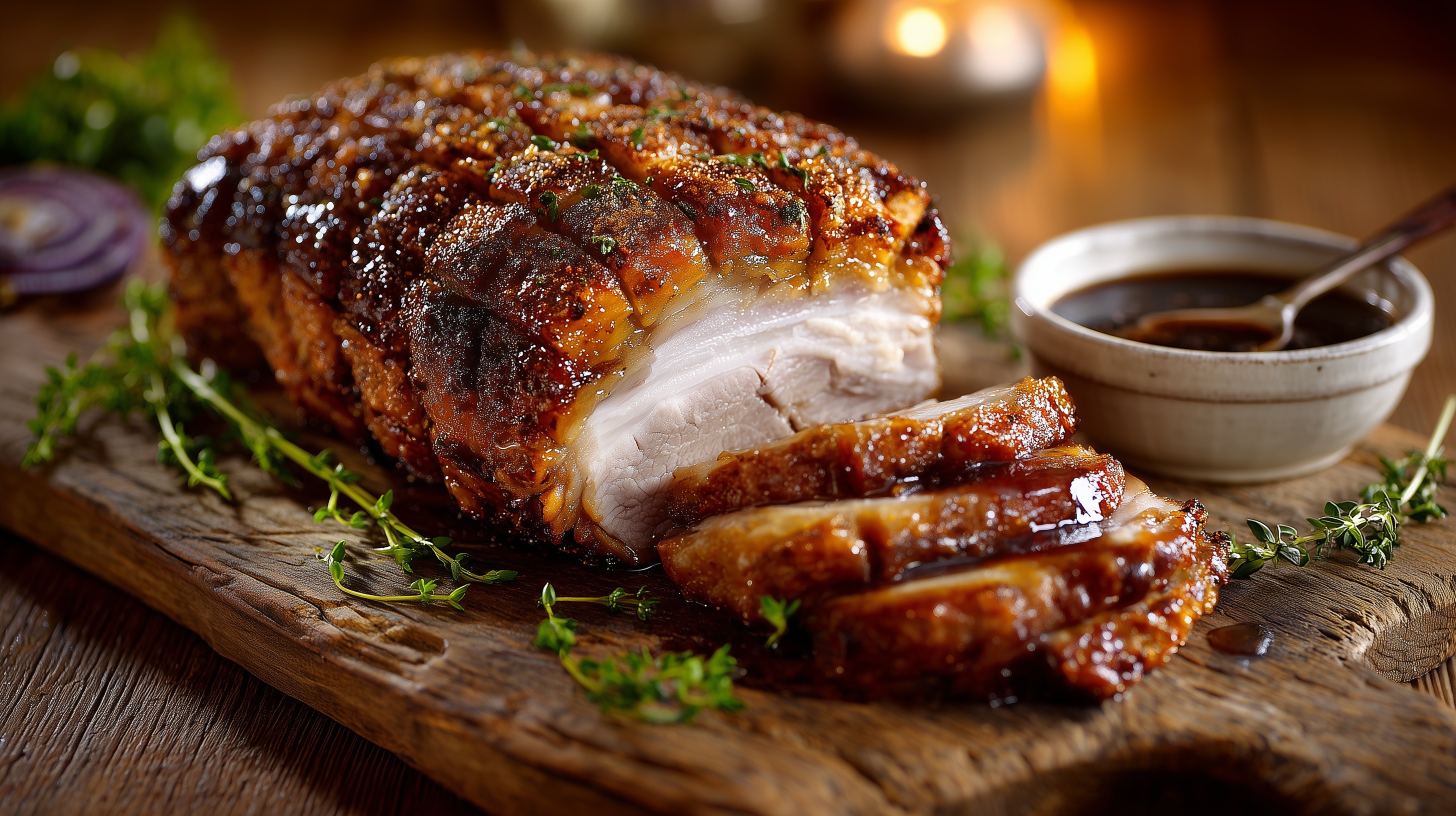 - Den Krustenbraten in Scheiben schneiden, auf einem Holzbrett anrichten, mit frischem Thymian garnieren und die Soße separat dazu servieren.