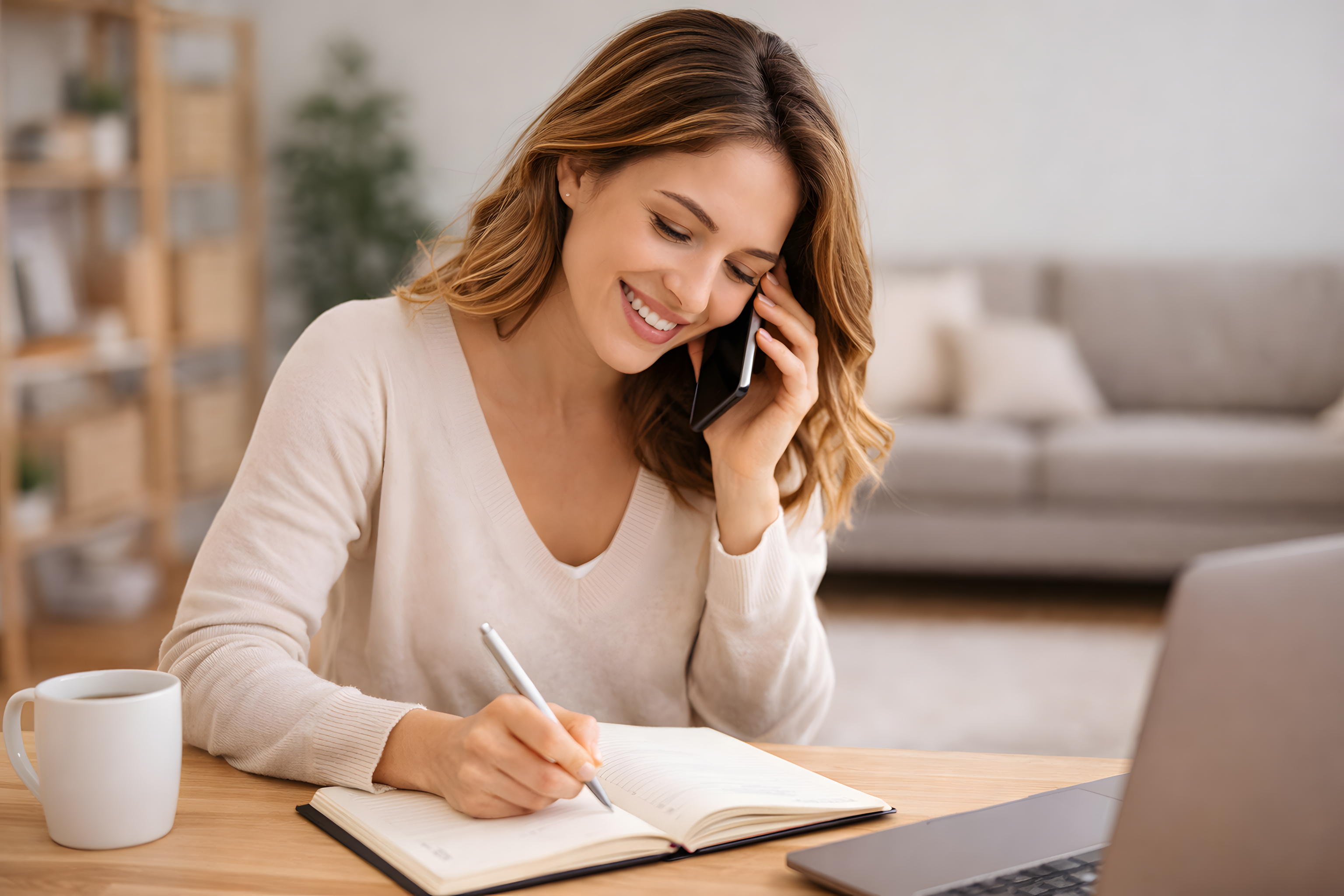 Das Foto zeigt eine junge, lächelnde Frau mit lockigem blondem Haar, die an einem hellen Holzschreibtisch sitzt und gleichzeitig telefoniert und Notizen in ein aufgeschlagenes Notizbuch schreibt. Sie trägt einen cremefarbenen V-Ausschnitt-Pullover und hält ein schwarzes Smartphone ans Ohr, während sie mit einem Kugelschreiber schreibt.