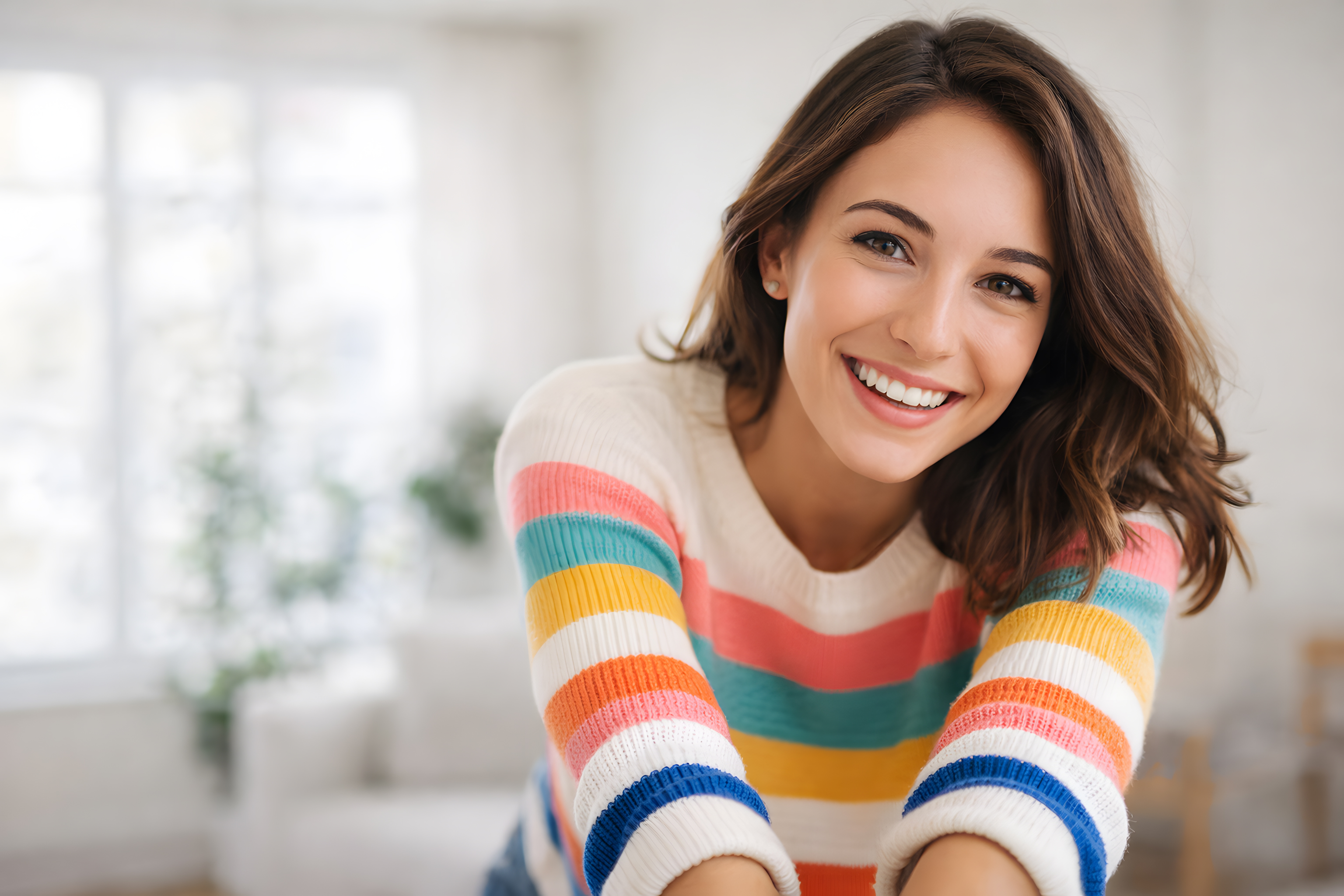 Dieses Foto zeigt eine junge, brünette Frau mit schulterlangem, leicht gewelltem Haar, die direkt in die Kamera lächelt. Ihr offenes, strahlendes Lächeln und der entspannte Blick verleihen dem Bild eine warme, einladende Atmosphäre. Sie trägt einen kuscheligen Pullover mit bunten Querstreifen in Orange, Pink, Türkis, Gelb, Weiß und Blau, der Lebendigkeit und Leichtigkeit ausstrahlt.