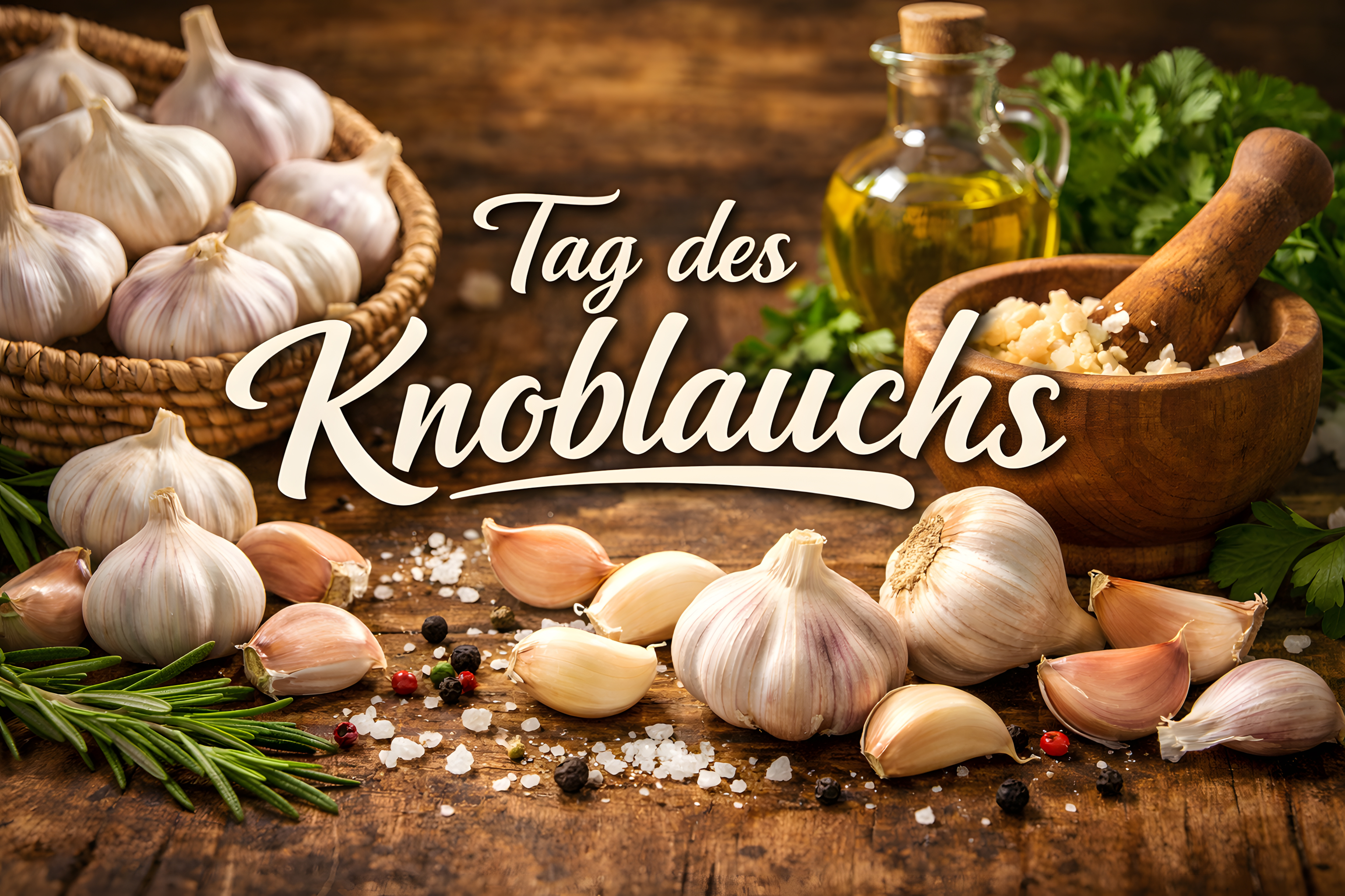 Die warme, erdige Farbpalette in Braun-, Beige- und Cremetönen verleiht dem Bild eine gemütliche, mediterrane Atmosphäre. Im Zentrum des Bildes steht der geschwungene Schriftzug «Tag des Knoblauchs» in elegantem Creme-Weiß, der das Motiv als Aktions- oder Feiertags-Banner kennzeichnet.