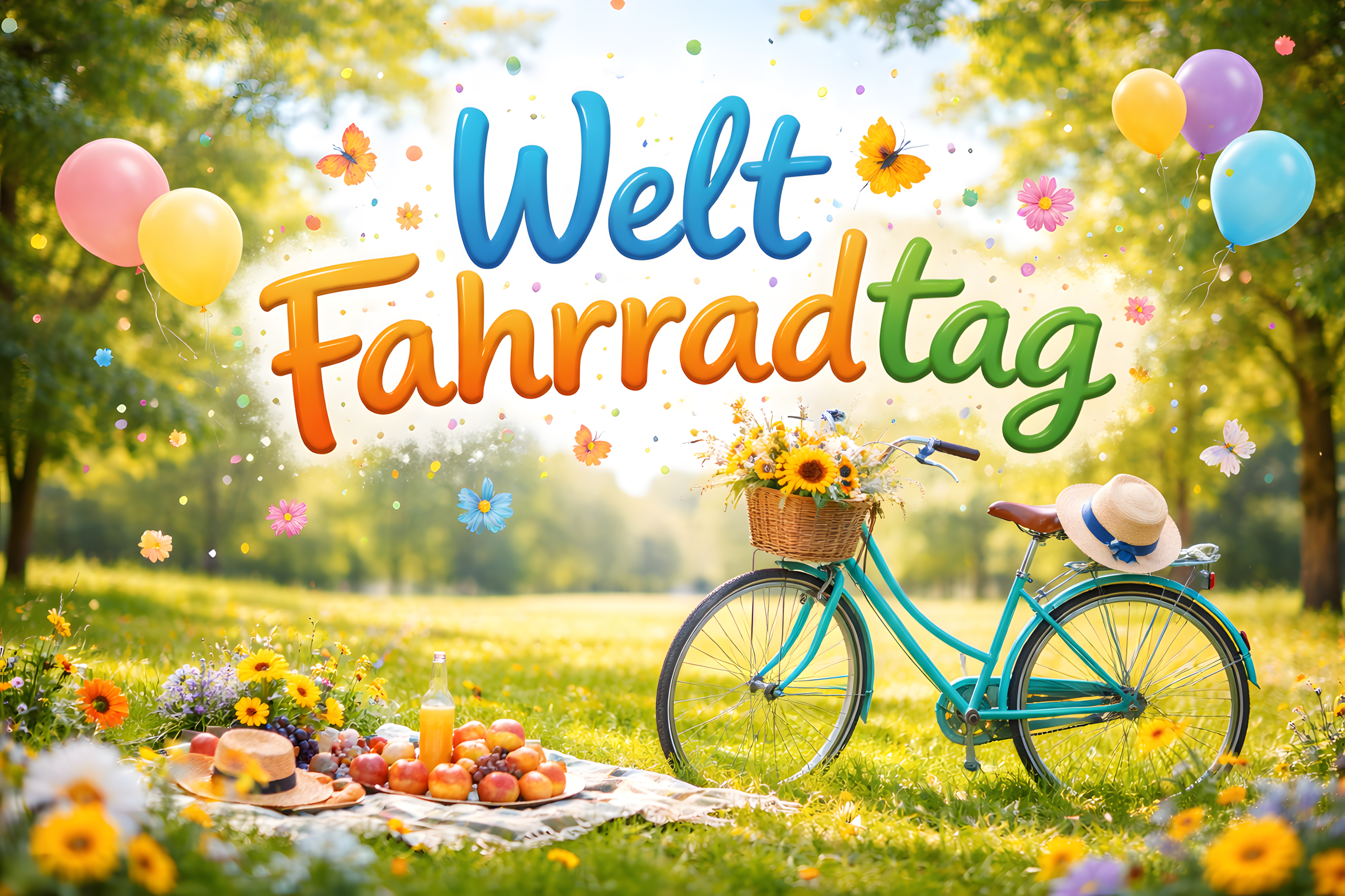 Das Bild eignet sich hervorragend für Social-Media-Beiträge rund um den Welt-Fahrradtag am 3. Juni, für Blog-Artikel zu Themen wie Nachhaltigkeit, Radfahren und Umweltschutz sowie für Newsletter-Kampagnen, Präsentationen oder digitale Grußkarten. Die warme, sonnige Atmosphäre und die klare Typografie machen das Motiv zu einem aufmerksamkeitsstarken Hingucker für jede Kommunikationsmaßnahme rund um das Thema Fahrrad und aktive Mobilität.