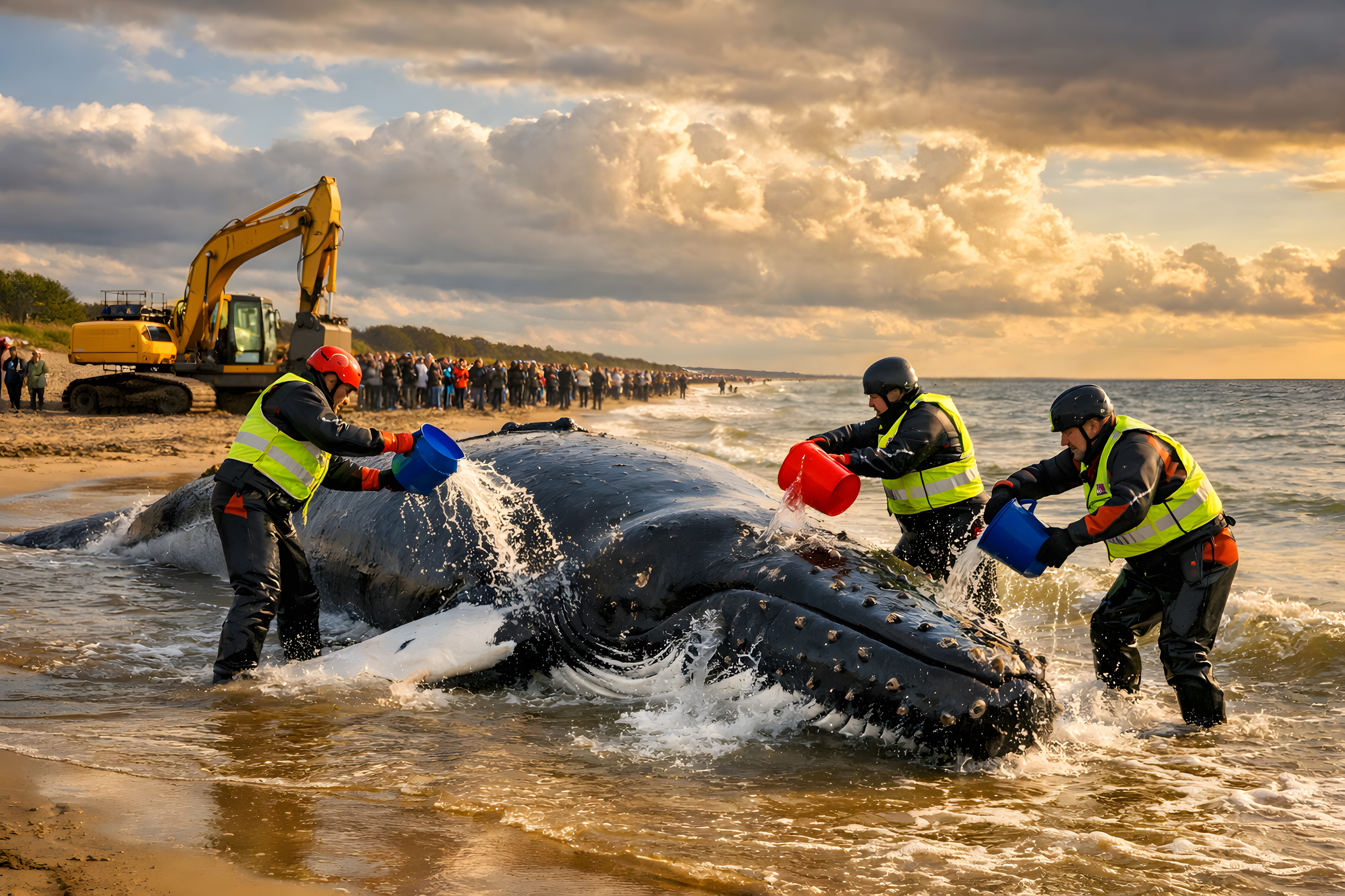 Die Fotografie besticht durch ihre dynamische Komposition, warme Lichtgebung und den starken Kontrast zwischen der dunklen Walsilhouette und den leuchtenden Warnwesten der Retter. Das Bild eignet sich hervorragend für Beiträge zu Umweltschutz, Meeresbiologie und Tierschutz, für Nachrichtenportale, Social-Media-Kampagnen, Naturschutzorganisationen sowie für Präsentationen und Newsletter rund um die Themen Rettungseinsätze, Küstenschutz und Meeressäuger.