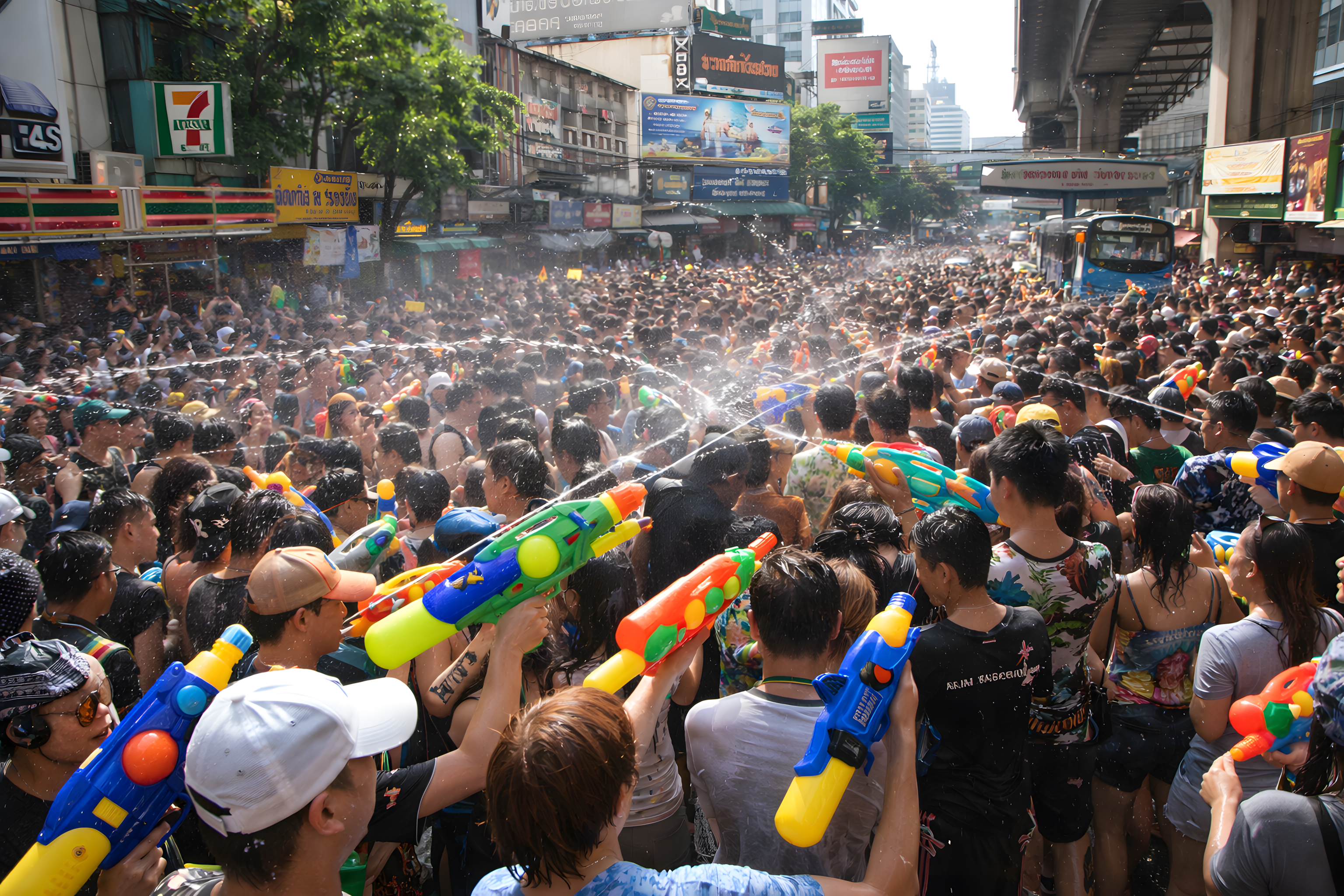 Dieses beeindruckende Foto zeigt das berühmte Songkran-Wasserfest in Bangkok, Thailand. Auf einer vollständig mit Menschen gefüllten Stadtstraße kämpfen Tausende Feiernde mit bunten Wasserpistolen in Grün, Orange, Blau und Gelb gegeneinander. Im Vordergrund sind mehrere große Wasserpistolen zu sehen, die kräftige Wasserstrahlen in die Menge spritzen.