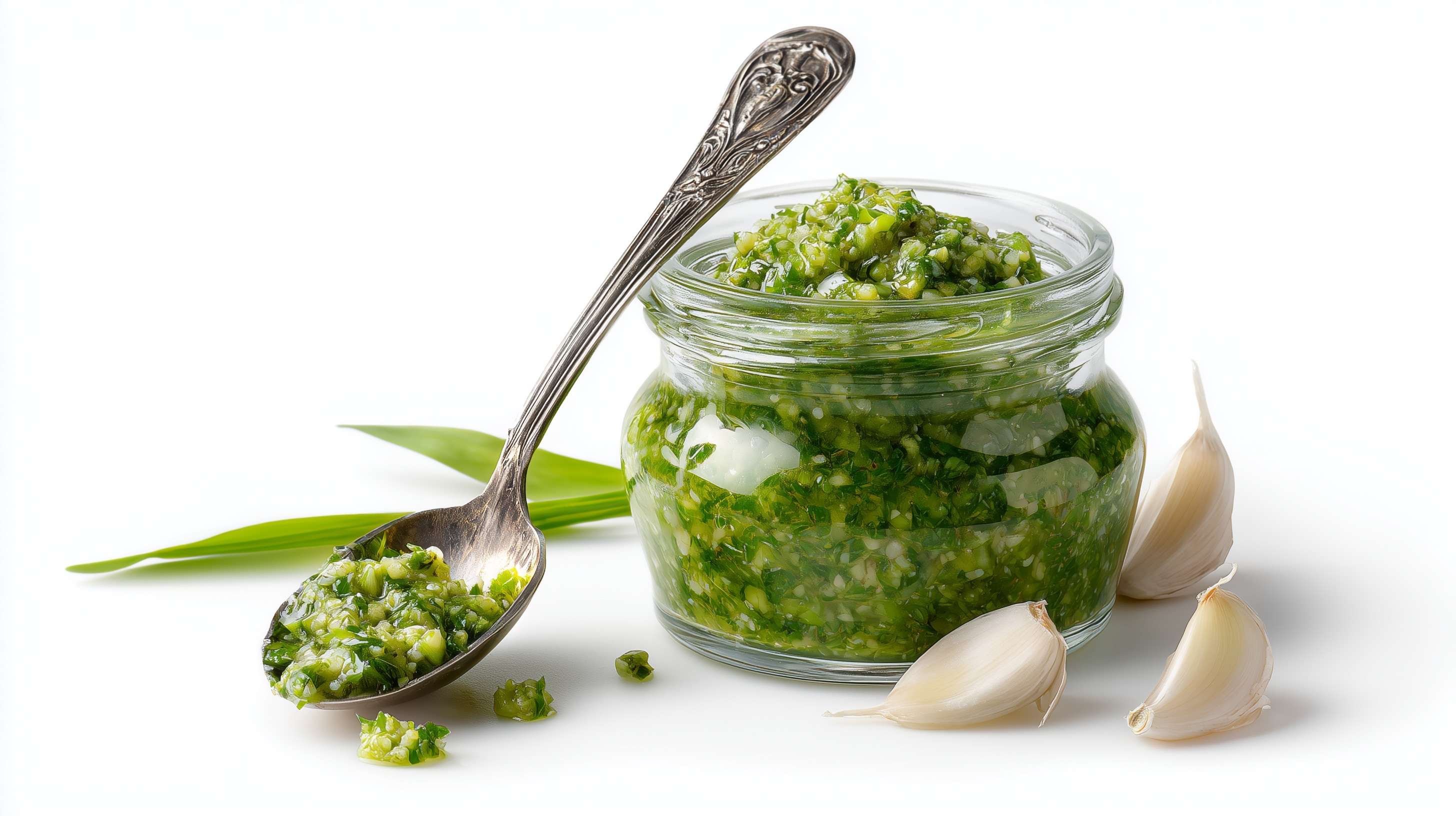 Bärlauchpesto im Glas mit Knoblauch und Löffel von Marco Verch unter Creative Commons 4.0