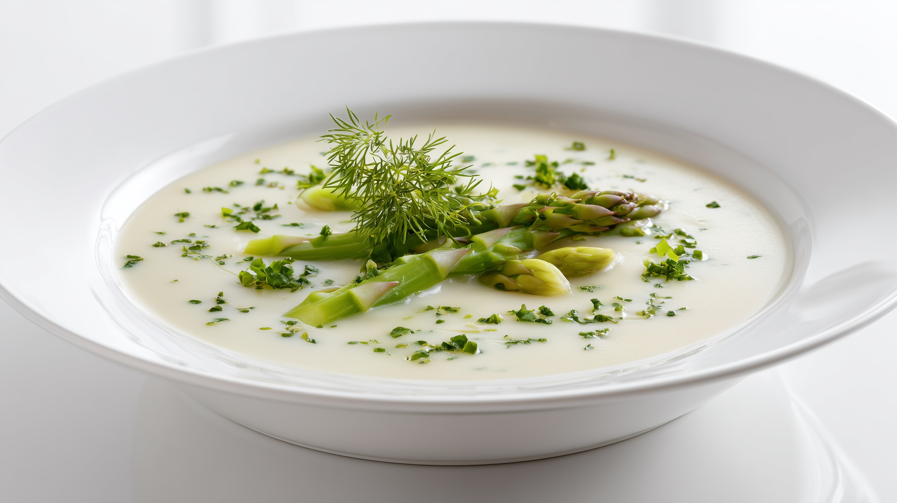 - Die Suppe in vorgewärmte Teller füllen. Mit den blanchierten Spargelspitzen, gehackter Petersilie und frischen Dillzweigen garnieren. Sofort servieren.
