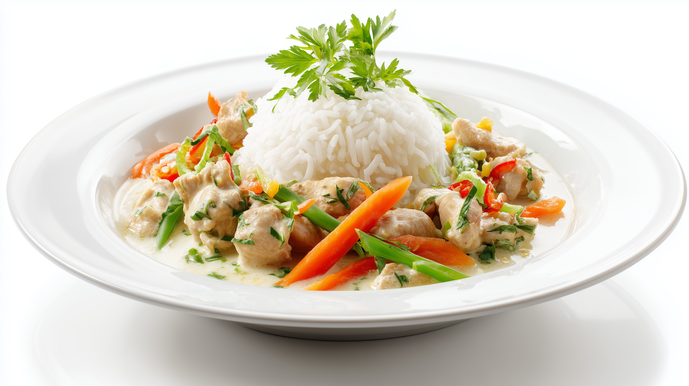 - Den Reis mithilfe einer Schüssel oder eines Ringes als Turm in der Mitte tiefer Teller anrichten. Das Hühnerfrikassee rundherum verteilen, mit Frühlingszwiebelringen sowie frischer Petersilie oder Koriander garnieren und sofort servieren.