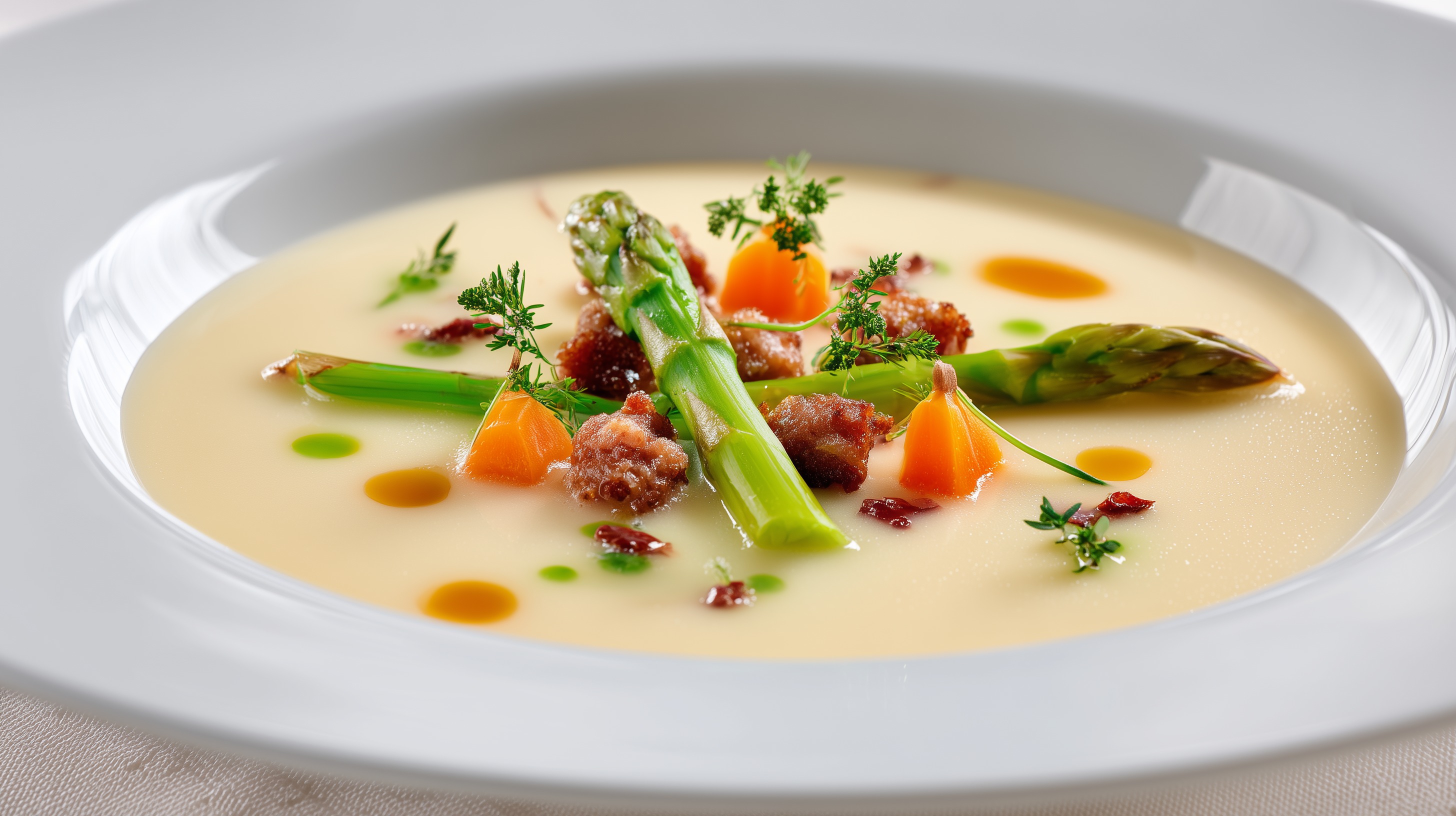 - Die Suppe in vorgewärmte tiefe Teller gießen. Grüne Spargelstangen und einige Karottenwürfel in die Mitte legen, knusprige Speckwürfel darüber streuen und mit frischen Kräutern garnieren. Nach Wunsch mit einigen Tropfen Kräuteröl oder Karottenreduktion dekorieren.
