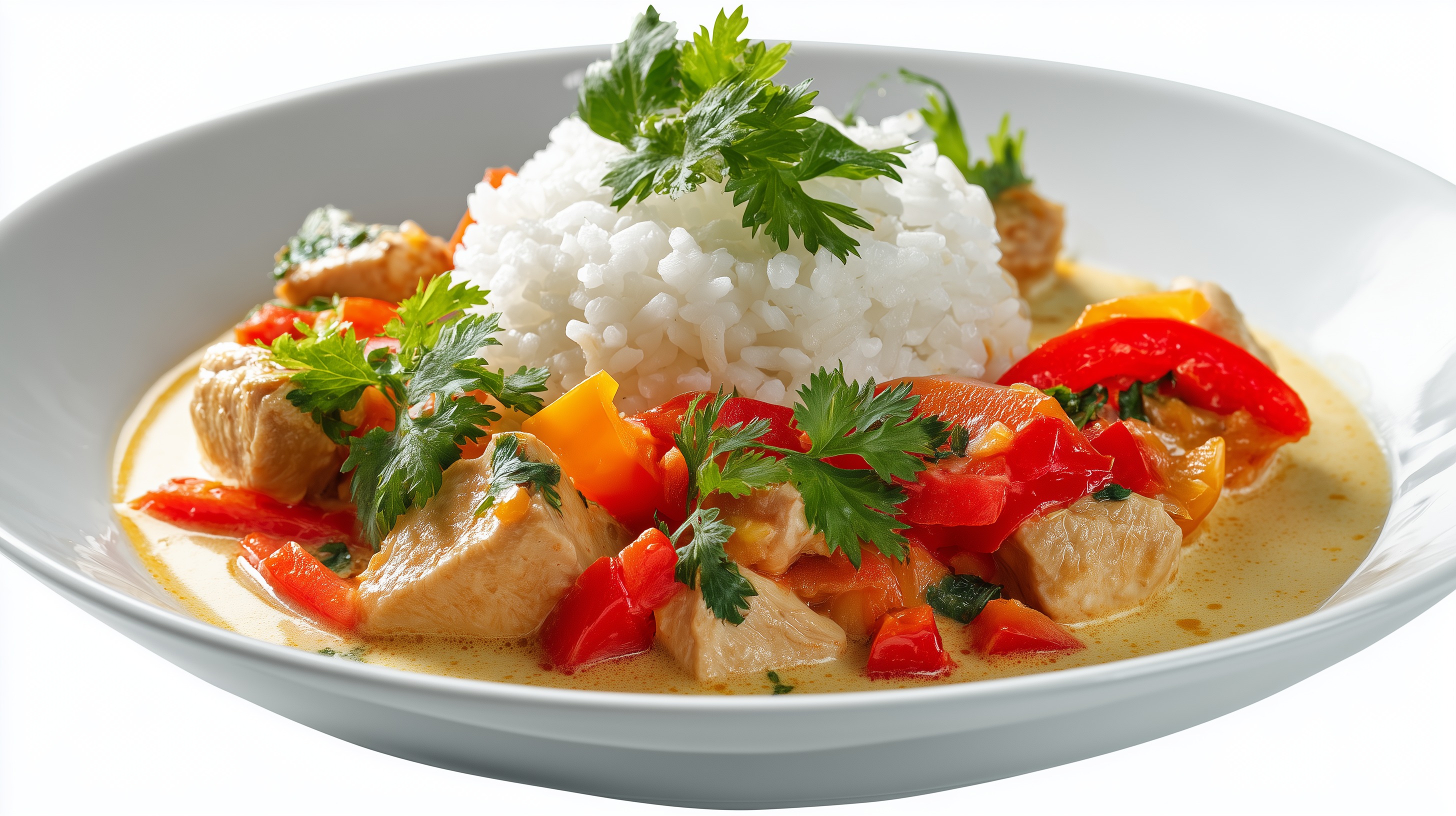 Tipp: Für eine intensivere Kokosnote die Kokosmilch nicht komplett einrühren, sondern am Ende einen Schuss ungemischte Kokosmilch (das cremige Fett oben in der Dose) über das fertige Curry träufeln. Wer es schärfer mag, gibt noch eine frische rote Chilischote in feine Ringe geschnitten mit in die Sauce.