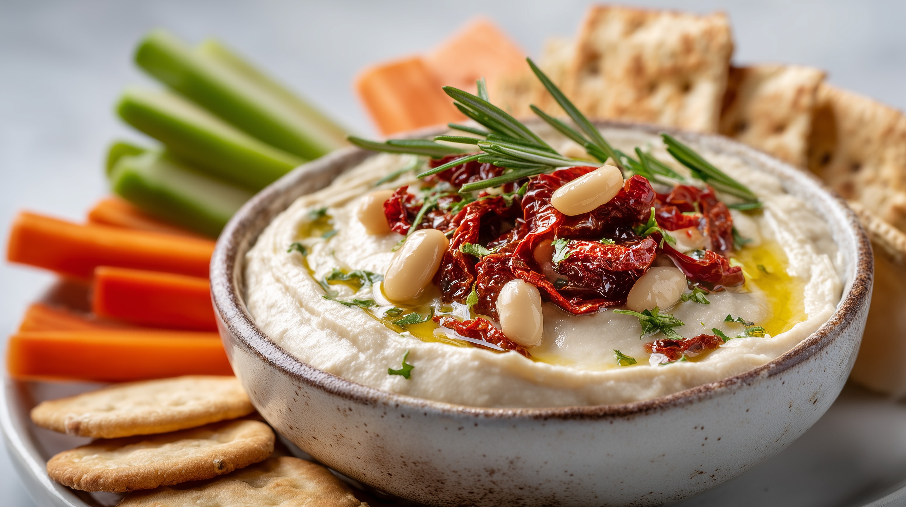 - Die restlichen getrockneten Tomaten, die beiseitegelegten Bohnen und die gehackte Petersilie auf dem Dip verteilen. Mit einem Schuss Olivenöl beträufeln und die Rosmarinzweige als Dekoration hineinstecken.