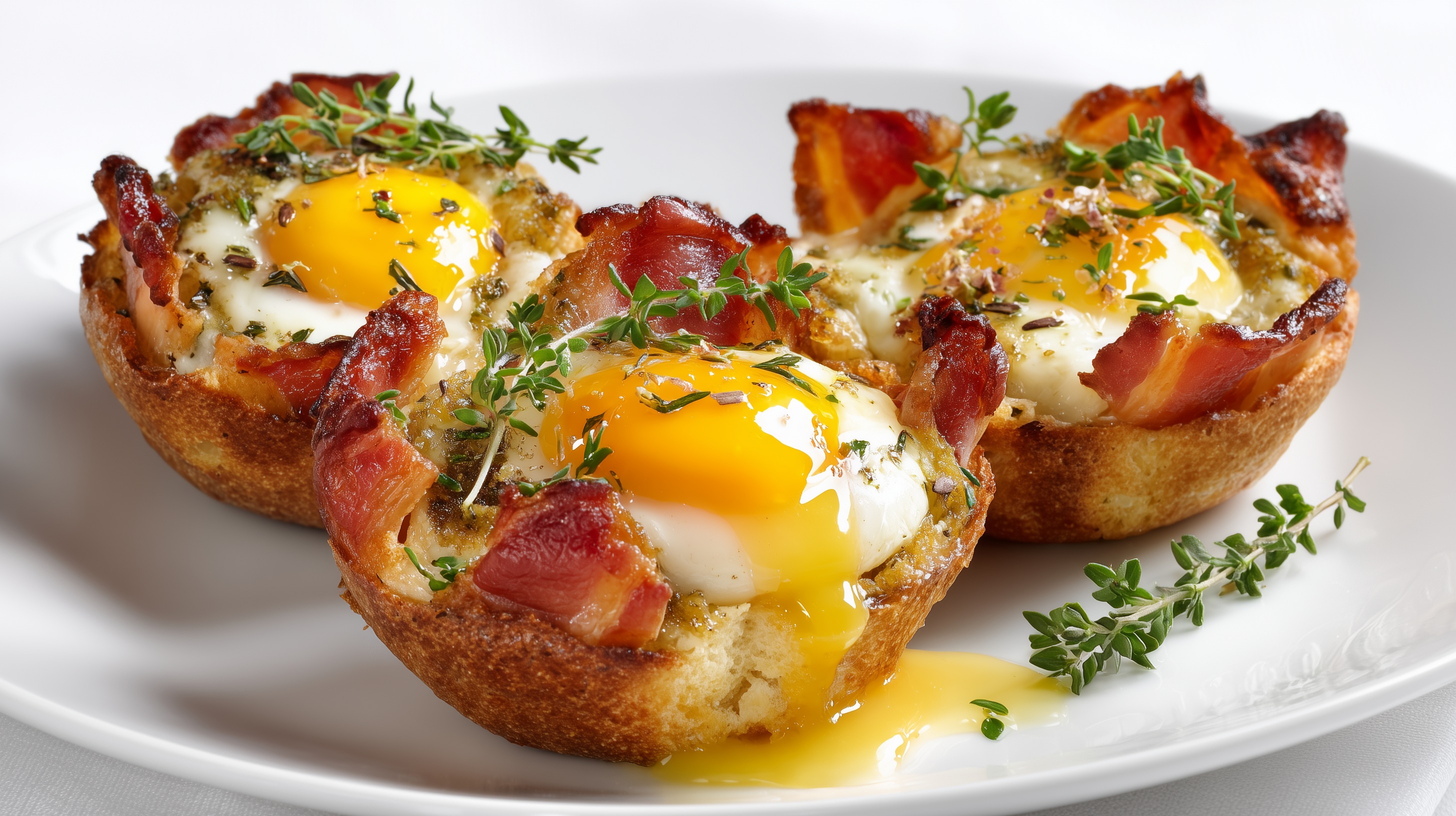 Tipp: Für eine besonders knusprige Toast-Schale die Muffins in den letzten 2–3 Minuten kurz auf die Grillfunktion schalten. Wer mag, kann das Pesto durch Frischkäse oder Tomatensauce ersetzen – beides harmoniert hervorragend mit Ei und Speck.