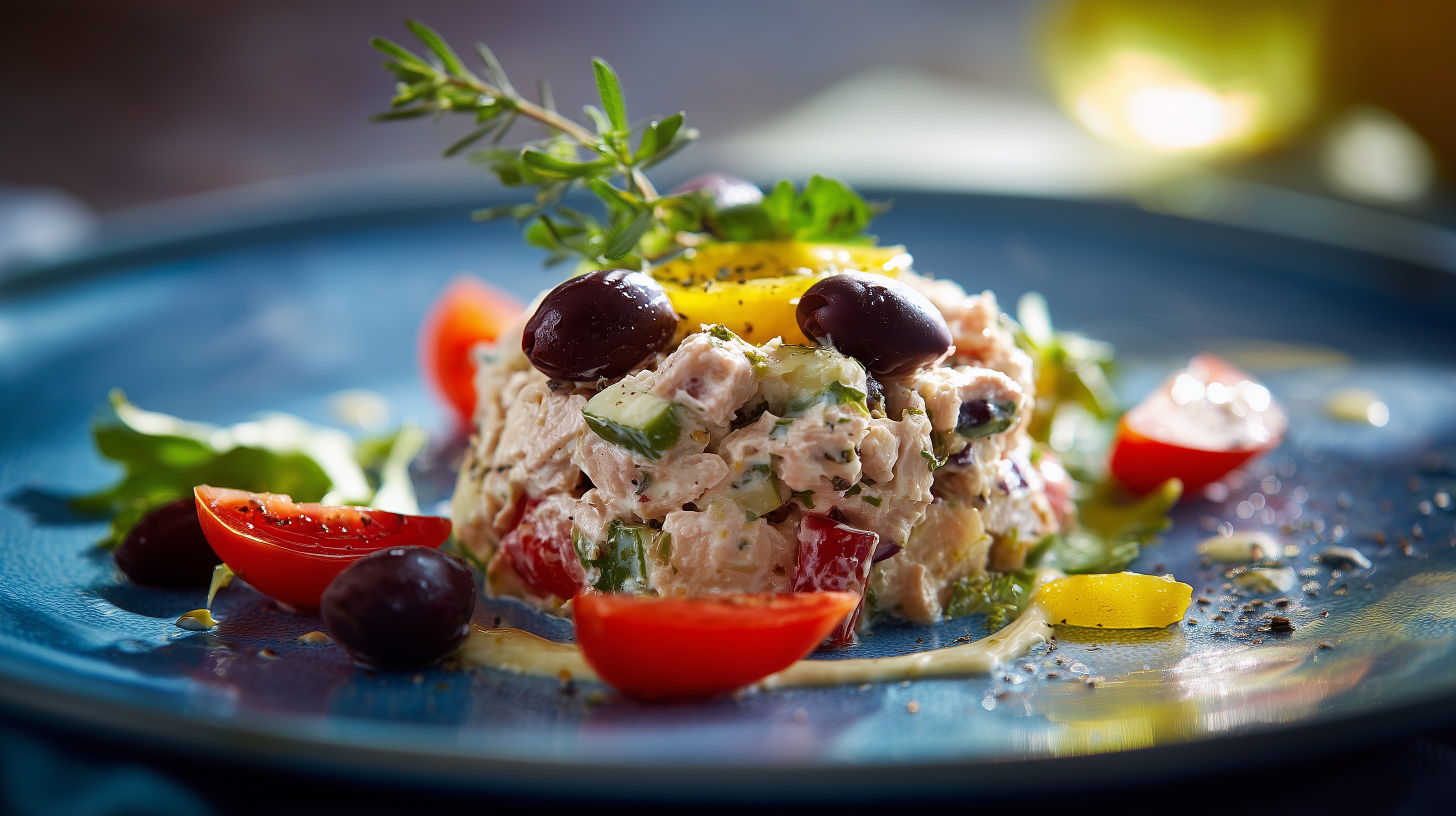 - Salat mischen: Thunfisch, Kirschtomaten, Gurke, Paprika, rote Zwiebel und Oliven in der Schüssel vermengen. 4–5 EL der Aioli dazugeben und alles vorsichtig vermengen, bis der Salat cremig gebunden ist.
