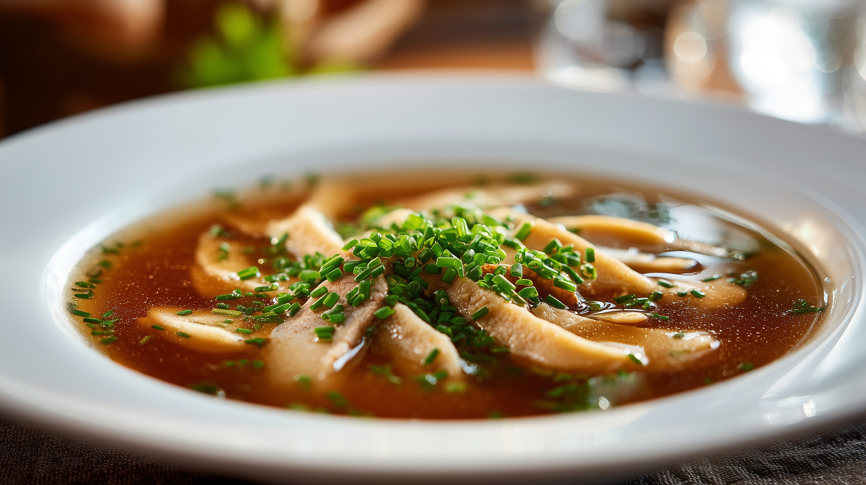 - Anrichten: Die Flädlestreifen gleichmäßig auf vier vorgewärmte, tiefe Teller verteilen. Die heiße Rinderbrühe darübergießen. Mit reichlich frischem Schnittlauch bestreuen und sofort servieren.
