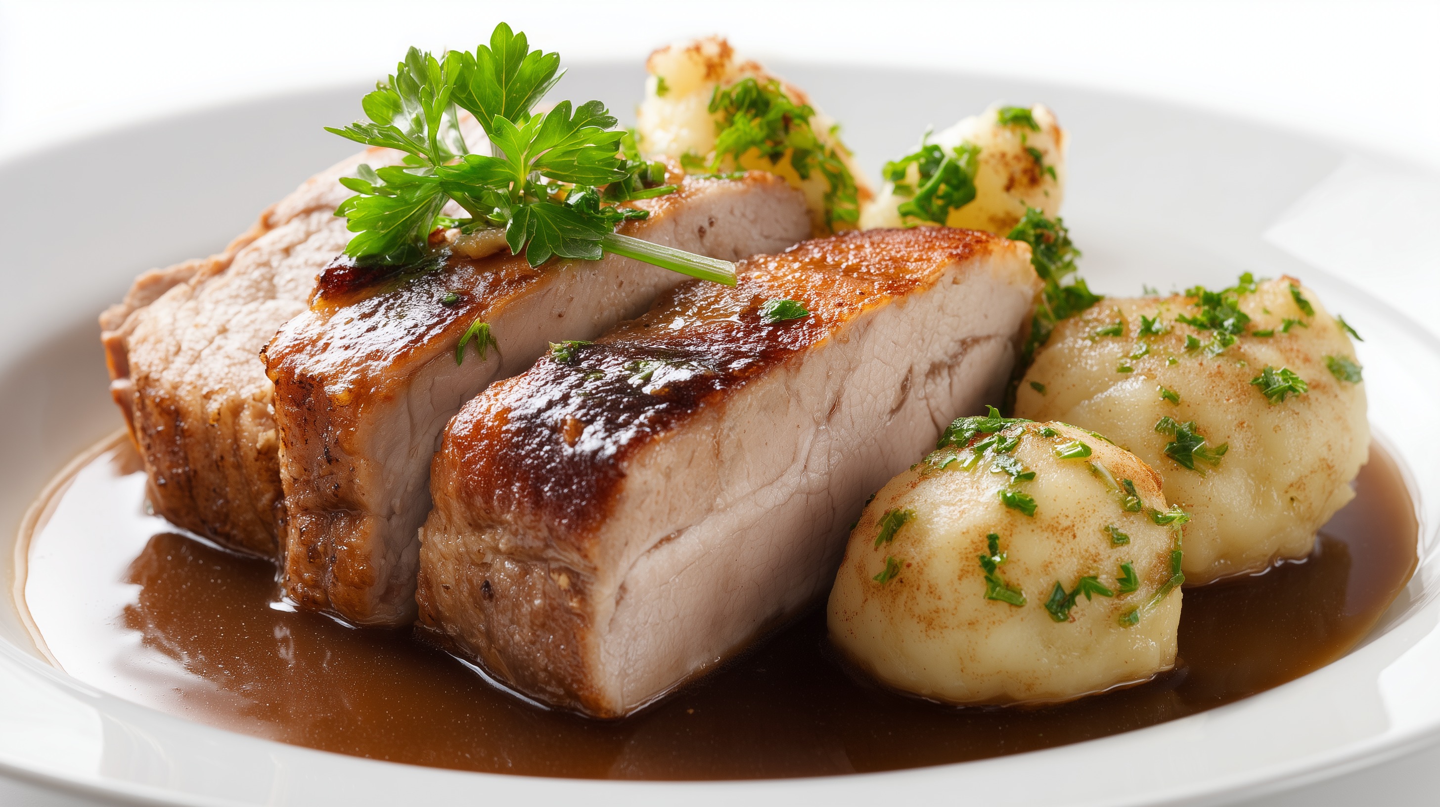 - Den Braten in Scheiben schneiden und zusammen mit den Klößen auf Tellern anrichten. Die Soße darübergießen und mit frischer Petersilie garnieren.