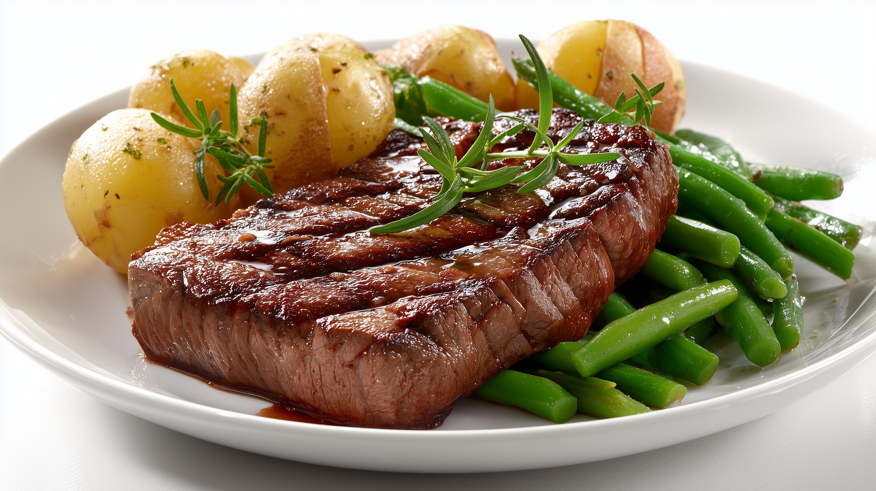 - Anrichten: Je ein Steak auf einem Teller anrichten, mit einem Pinsel etwas BBQ-Sauce darüber streichen. Speckbohnen und gebratene Drillinge daneben anrichten. Nach Belieben mit einem frischen Rosmarinzweig garnieren und sofort servieren.