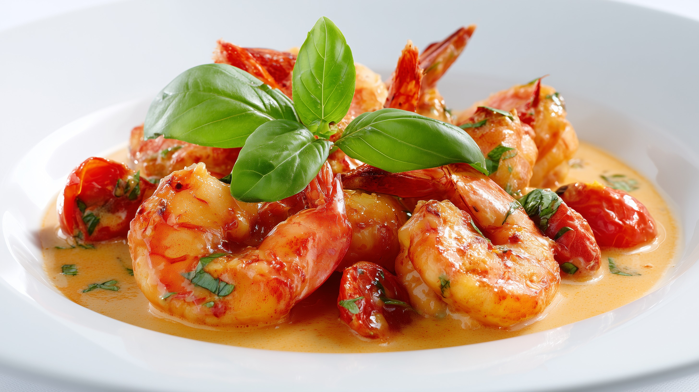- Gebratene Garnelen zurück in die Pfanne geben und kurz in der Soße erwärmen.