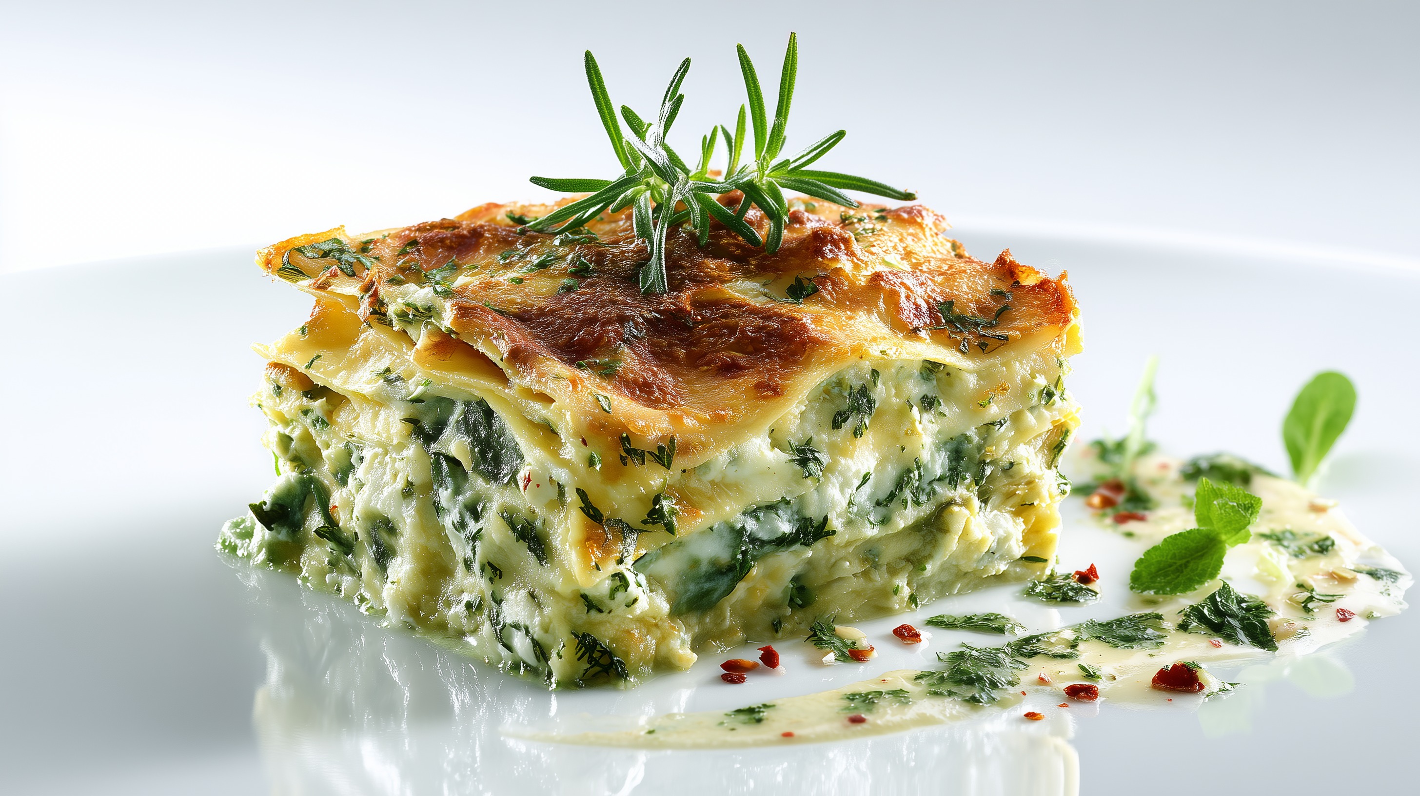 - Ruhen lassen und servieren: Die Lasagne nach dem Backen ca. 10 Minuten ruhen lassen, damit sie sich besser portionieren lässt. Mit frischem Rosmarin und Basilikum garnieren und mit der cremigen Soße aus der Form servieren.