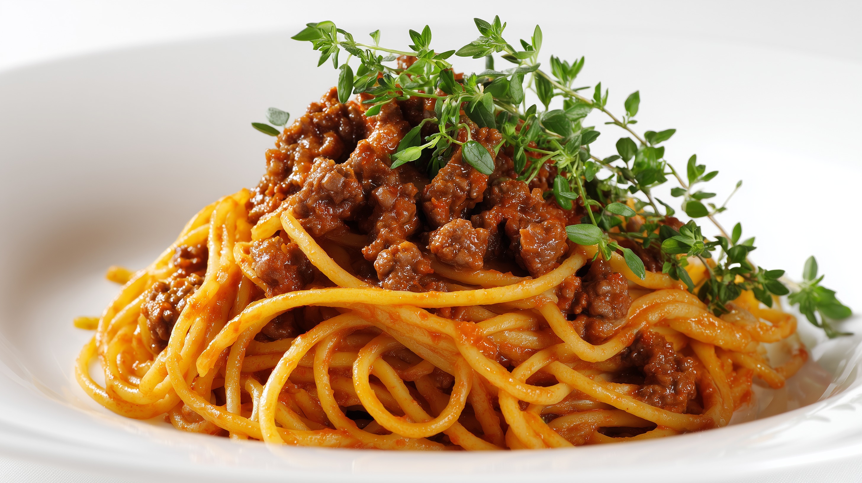 - Die Spaghetti mit einem Küchengreifer auf tiefen weißen Teller aufdrehen, großzügig mit der Tatar-Ajvar-Sauce belegen und mit frischen Thymianzweigen garnieren. Nach Wunsch mit Parmesan bestreuen und sofort servieren.
