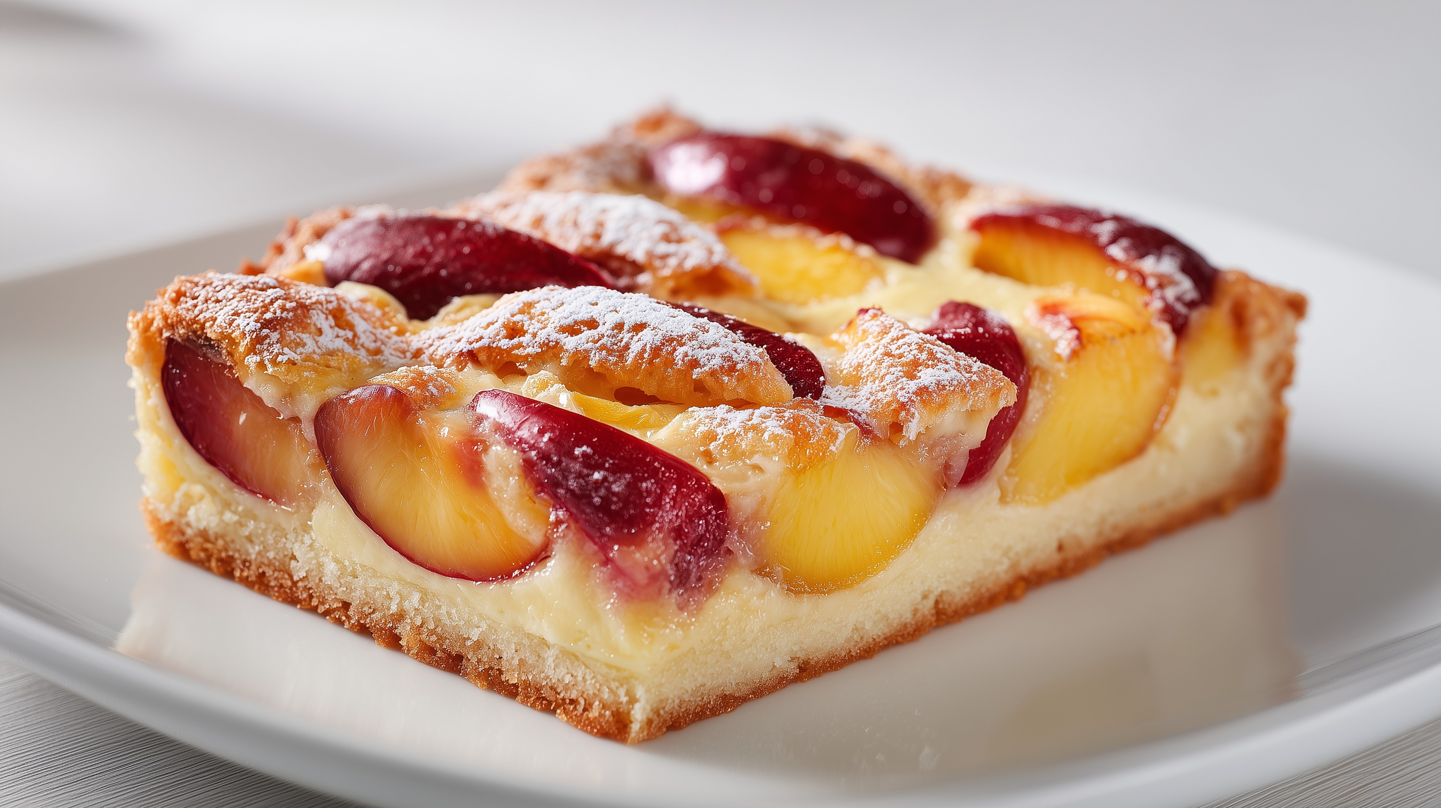 - Den Kuchen im vorgeheizten Ofen auf mittlerer Schiene ca. 40–45 Minuten backen, bis der Guss gestockt und leicht goldgelb ist. Mit einem Zahnstocher die Garprobe machen.
