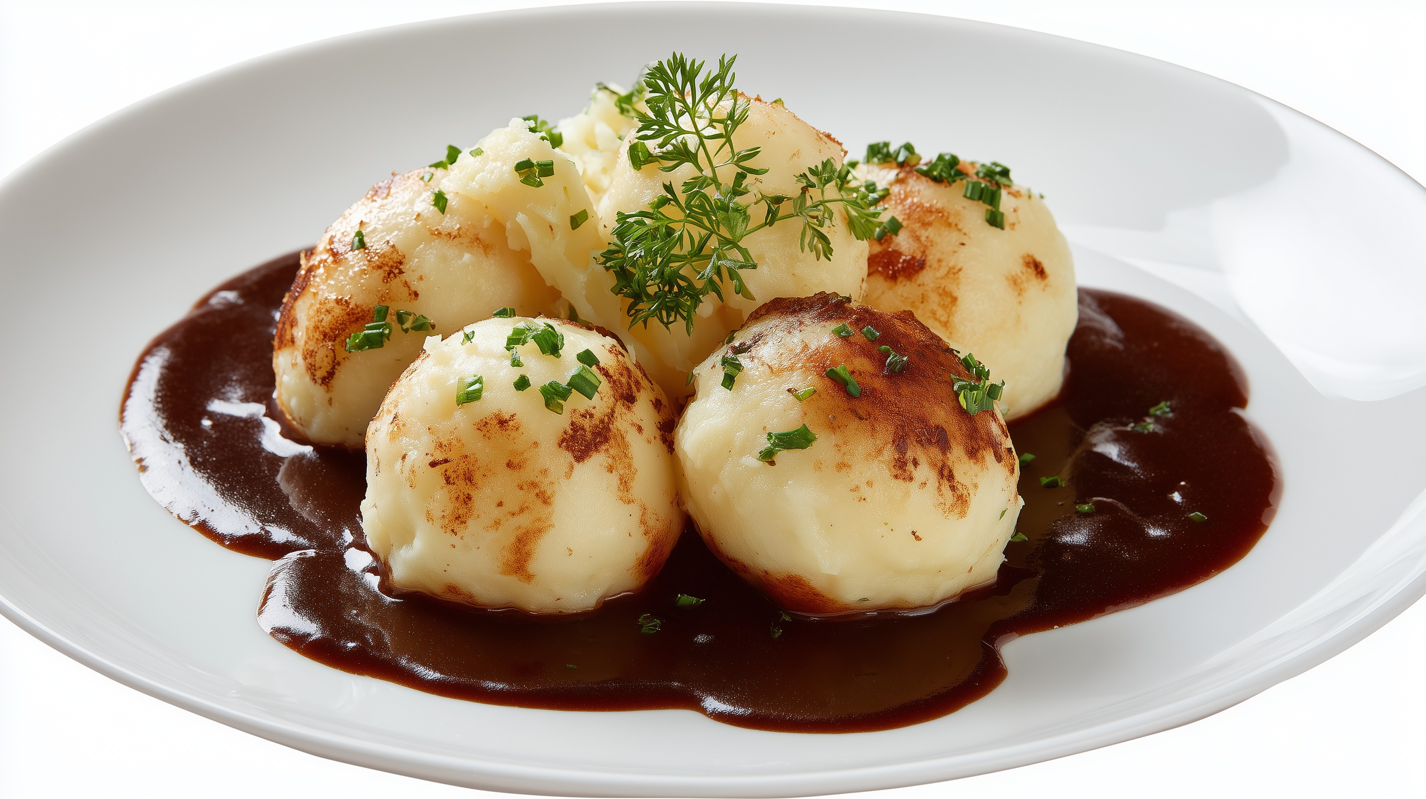 - Anrichten: Die Knödel auf tiefen Tellern mit der dunklen Soße anrichten und mit frisch gehacktem Schnittlauch sowie Petersilienblättern garnieren. Sofort servieren.