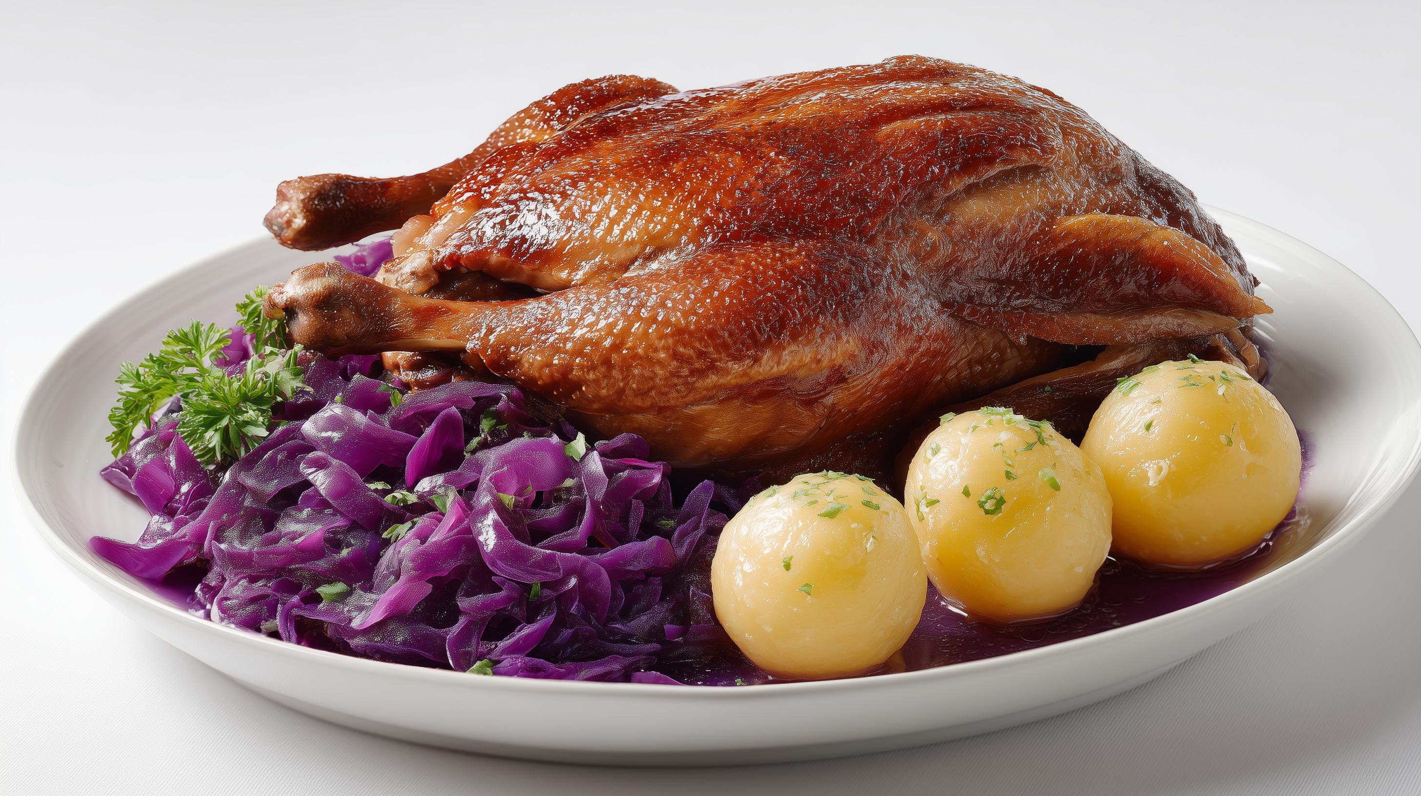 - Anrichten: Ente tranchieren und mit Klößen, Rotkohl und der Soße auf vorgewärmten Tellern anrichten. Mit frischer Petersilie garnieren.